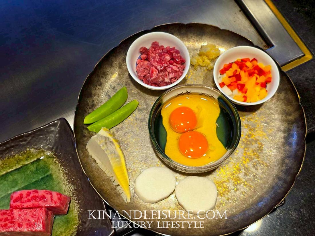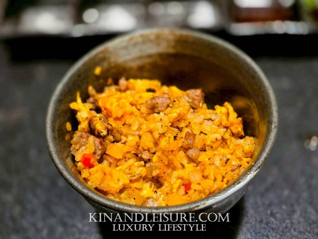 ปิดท้ายมื้ออาหารด้วย ข้าวผัดกระเทียม ที่ไม่ธรรมดา เชฟนำเศษเนื้อส่วนที่ติดมัน (Burnt Ends) มาเจียวจนกรอบแล้วผัดลงไปในข้าวพร้อมกับผักจากฟาร์ม Senshu และไข่เป็ดแดงก่ำ