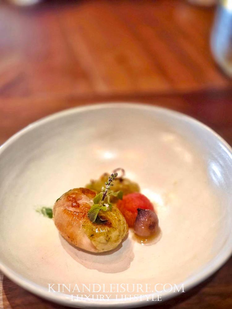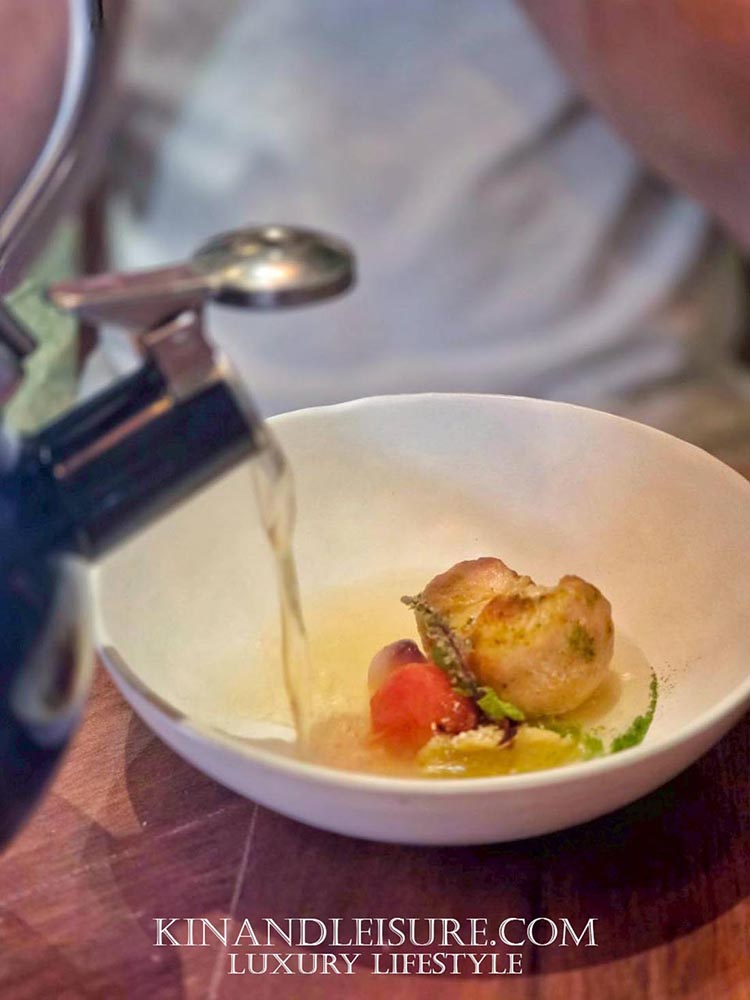 - 🦐 ปิดท้ายด้วยความสง่างามของโปรตีนชั้นเลิศ กุ้งทะเลขนาดใหญ่ (Prawn) ที่ถูกลวก/แช่เย็นจนเนื้อแน่นเด้ง (Pristine Texture) รสชาติของ “ก้อย” ถูกปรับให้มีความประณีตและสะอาดกว่าก้อยแบบดั้งเดิม เน้นความหวานตามธรรมชาติของกุ้งและรสเปรี้ยวนำที่สะอาด (Clean Acidity) เครื่องเคียงสีแดง-เหลือง ที่ท็อปด้านบน (อาจจะเป็นมะเขือเทศดอง, พริกชี้ฟ้า, หรือกระเทียมดองน้ำผึ้งตามที่ระบุ) คือการสร้าง “จุดโฟกัสรสชาติ” ที่ทำหน้าที่เป็นตัวตัดรส (Palate Cleanser) เพื่อเตรียมปากสำหรับคำต่อไป ความหวานอมเปรี้ยวและกลิ่นหอมฉุนอ่อนๆ คือการปิดฉากที่สง่างามและทันสมัย