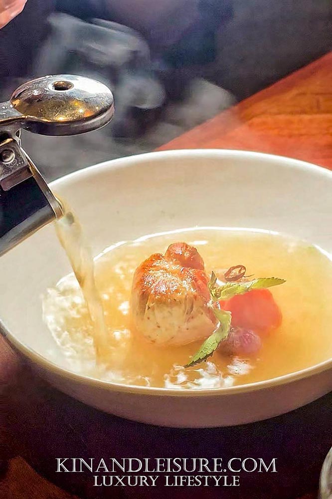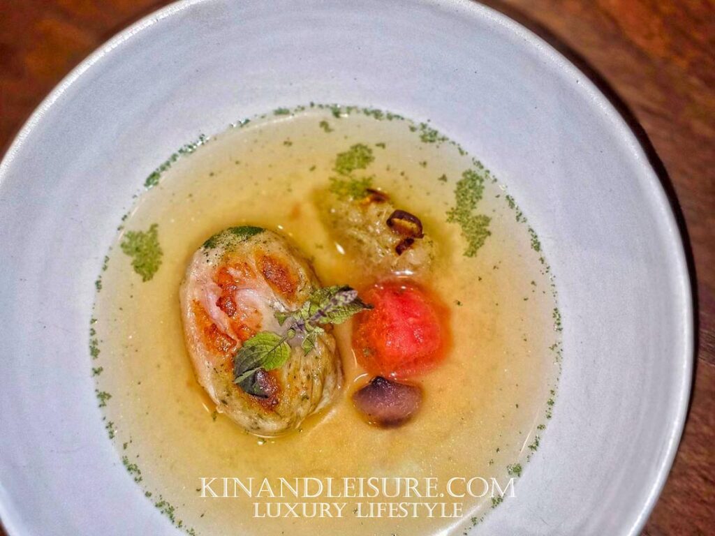 ล้างปากด้วย “ต้มแซ่บ” หรือต้มยำสไตล์อีสาน แต่เป็นต้มแซ่บที่ใสและพิถีพิถัน (ตามภาพที่กำลังรินซุป) ไฮไลท์คือ “ไก่ม้วน” พร้อม “paste ต้มแซ่บ” และมี “ใบหม่อน” เป็นจุดเด่น เมื่อซุปไก่ที่เคี่ยวจนได้ที่ถูกรินลงไป กลิ่นหอมก็อบอวล เนื้อไก่ม้วนนั้นนุ่มเด้งฉ่ำอย่างไม่น่าเชื่อ และมีกลิ่นหอมจากการย่างที่ผิวด้านนอกที่กรอบ เข้ากับเนื้อนุ่มด้านใน ซุปรสชาติกลมกล่อม เปรี้ยวเค็มเผ็ดอย่างผู้ดี