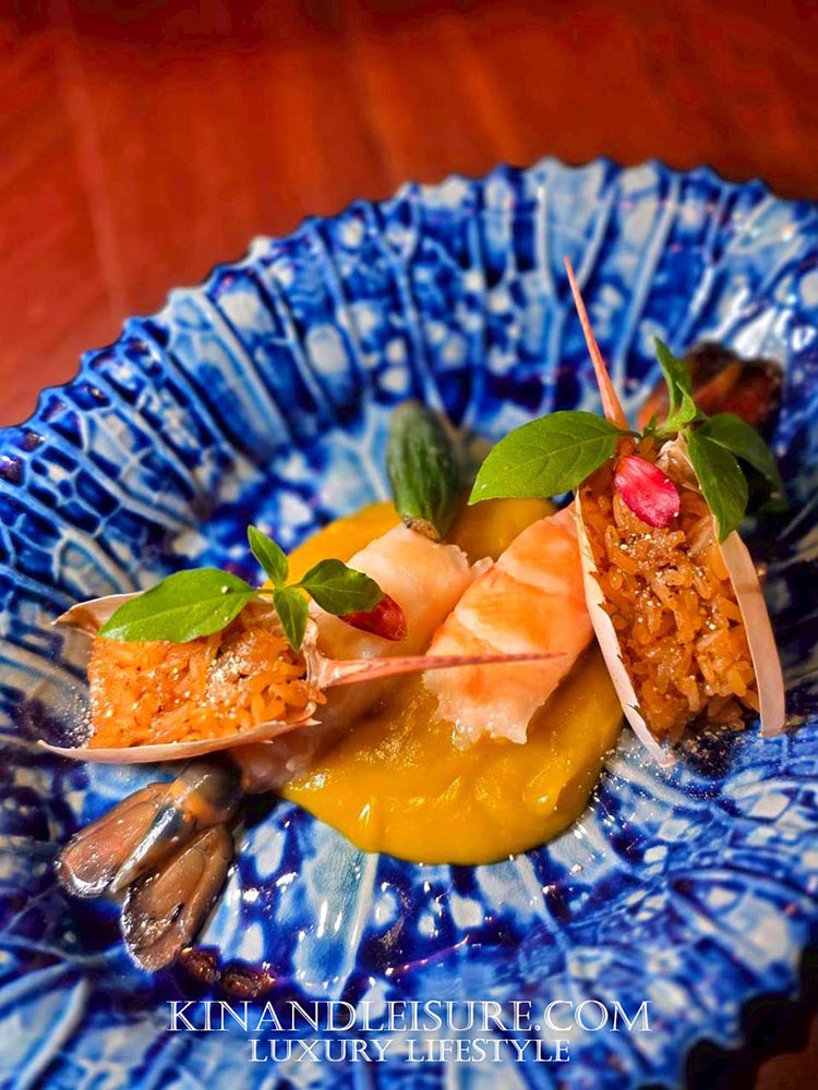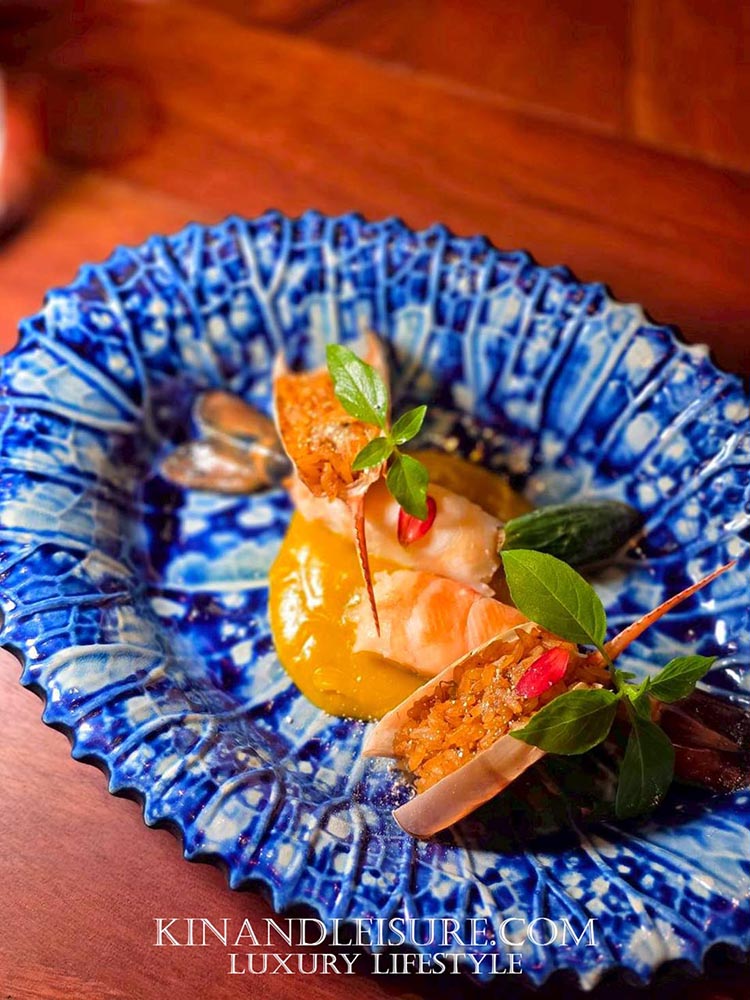 จานนี้คือความงดงามบนจานลายครามสีน้ำเงิน “อ่องกุ้ง” ที่ถูกตีความใหม่ โดยใช้ “ซอสอ่องฟักทอง” ผสมผสานกับ “เนย” เพื่อให้ได้รสชาติที่ทันสมัยและทานง่ายขึ้น แต่ยังคงความ “แซ่บนัว” ไว้อย่างครบถ้วนในแบบฉบับผู้ดี เสิร์ฟพร้อมมะเขือย่างและข้าวคั่วหอมหวานเพิ่มมิติของเนื้อสัมผัส