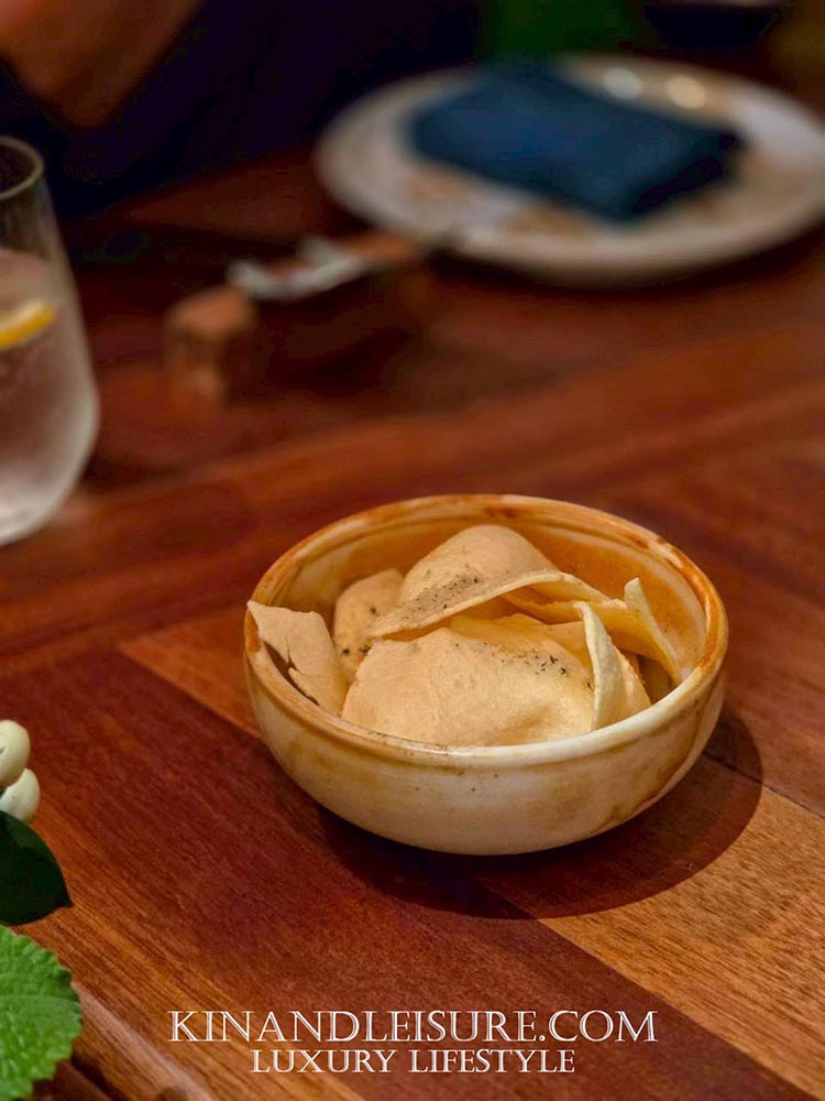 คำแรกที่เรียกน้ำย่อยคือ “ข้าวเกรียบใบหูเสือ” หรือ “อีสานออริกาโน” สัมผัสแรกคือความกรอบฟูของข้าวเกรียบที่หอมกลิ่นสมุนไพรชัดเจน แต่เนื้อสัมผัสด้านในที่แอบซ่อนความหนึบเหนียวเล็กน้อยไว้ ความขมนิด ๆ ช่วยให้อยากอาหาร เป็นการเปิดต่อมรับรสที่ชาญฉลาด