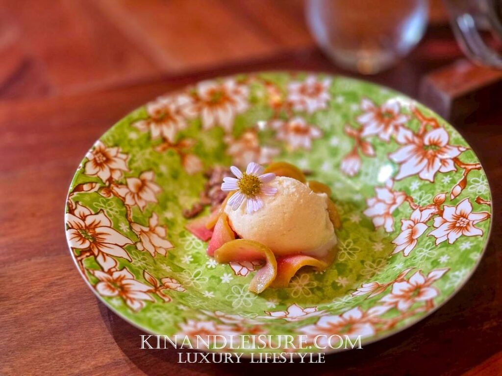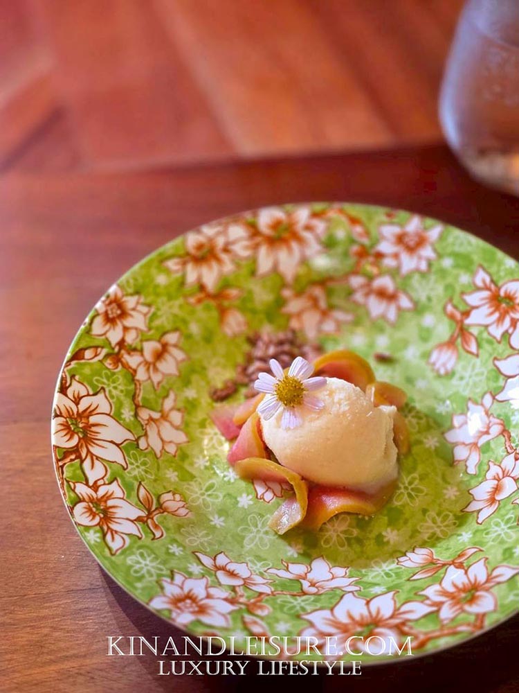 ปิดท้ายมื้ออย่างสดชื่นด้วย “ซอร์เบทสัปปะรดโยเกิร์ต” รสเปรี้ยวหวานลงตัว ทานคู่กับ “ฝรั่งตุ๋นสาโท” ที่นำสาโทจากช่วงต้นมาใช้ได้อย่างชาญฉลาด 4และเพิ่มความกบกรอบด้วย “ข้าวทับทิมชุมแพกรบ” เป็นการจบมื้อที่สมบูรณ์แบบ