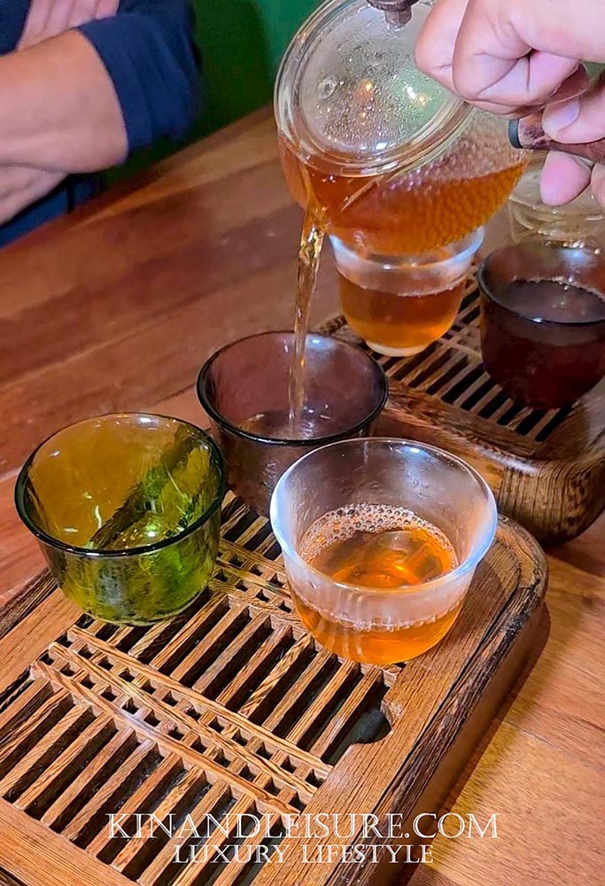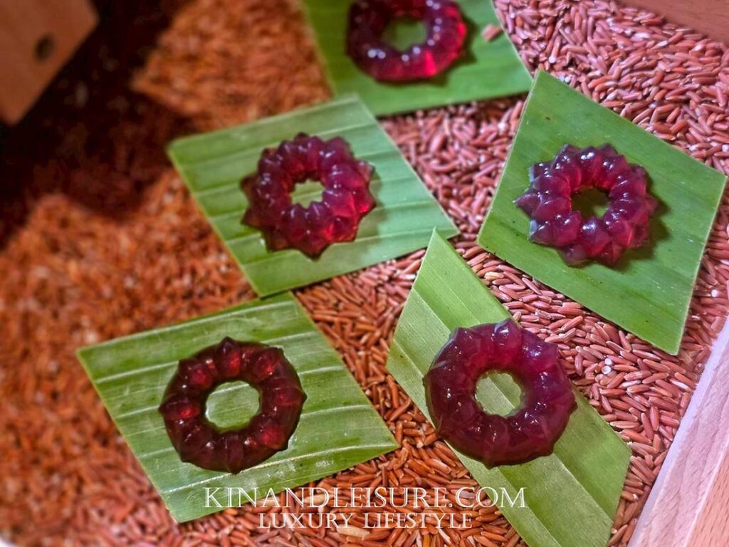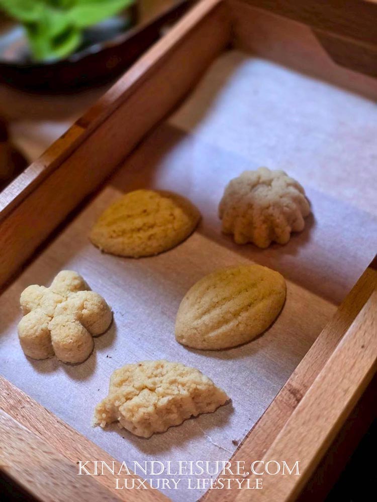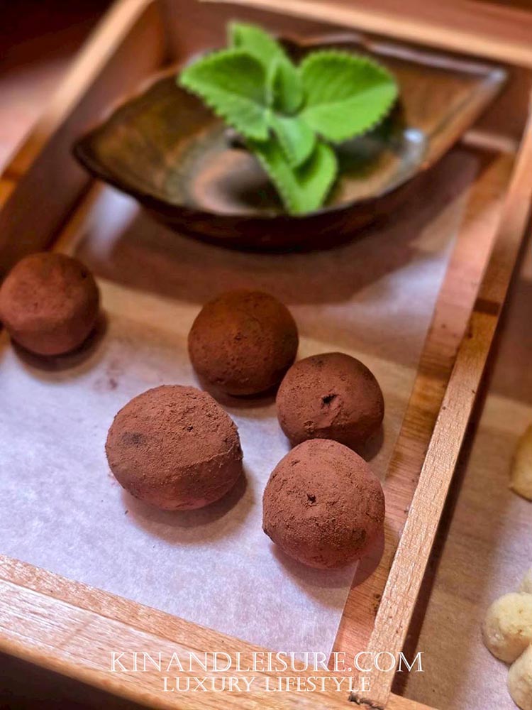 ความประทับใจยังไม่จบสิ้น “Petite four” ถูกเสิร์ฟมาในกล่องไม้ที่สวยงาม ภายในบรรจุของดีจากอีสาน ทั้ง “Jelly สาโท”, “Shortbread ลูกกระบก” ลูกกระบกหรือที่เรียกว่าอัลมอนด์อีสาน และ “Chocolate Truffle” ที่สอดไส้ “เหล้าคูน” ทานคู่กับ “ชามะตูม” ที่เบลนด์พิเศษกับ “ชะเอม” และ “ใบหูเสือ” ช่วยให้ผ่อนคลายและชุ่มคอ