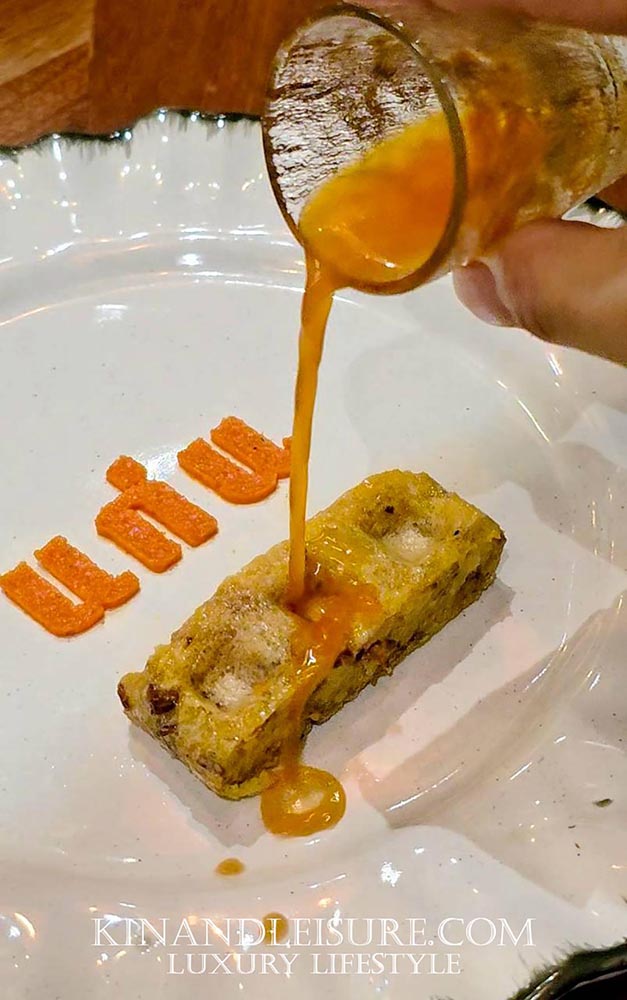 มื้ออาหารเปิดฉากอย่างแท้จริงด้วย “แจ่วบักเลน” (บักเลน หรือ มะเขือเทศในภาษาอีสาน) แต่ความพิเศษคือการนำมะเขือเทศไปย่างไฟก่อนเพื่อดึงความหอมและรสชาติที่ลึกขึ้น เสิร์ฟมาอย่างวิจิตรบนจานที่โรยผงเครื่องเทศเป็นคำว่า “แก่น” (ตามภาพ) ทานคู่กับ “วาเฟิลข้าวจี่” ที่ประยุกต์ข้าวจี่แบบดั้งเดิมให้ทันสมัยขึ้น และปิดท้ายด้วยการดื่ม “ชอตแจ่วบักเลน” ที่เสิร์ฟมาคู่กัน เป็นการระเบิดรสชาติเผ็ดร้อนที่ซับซ้อนและปลุกเร้าทุกประสาทสัมผัส