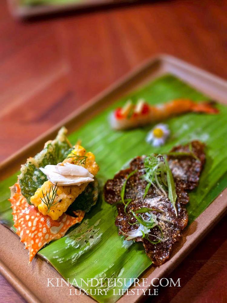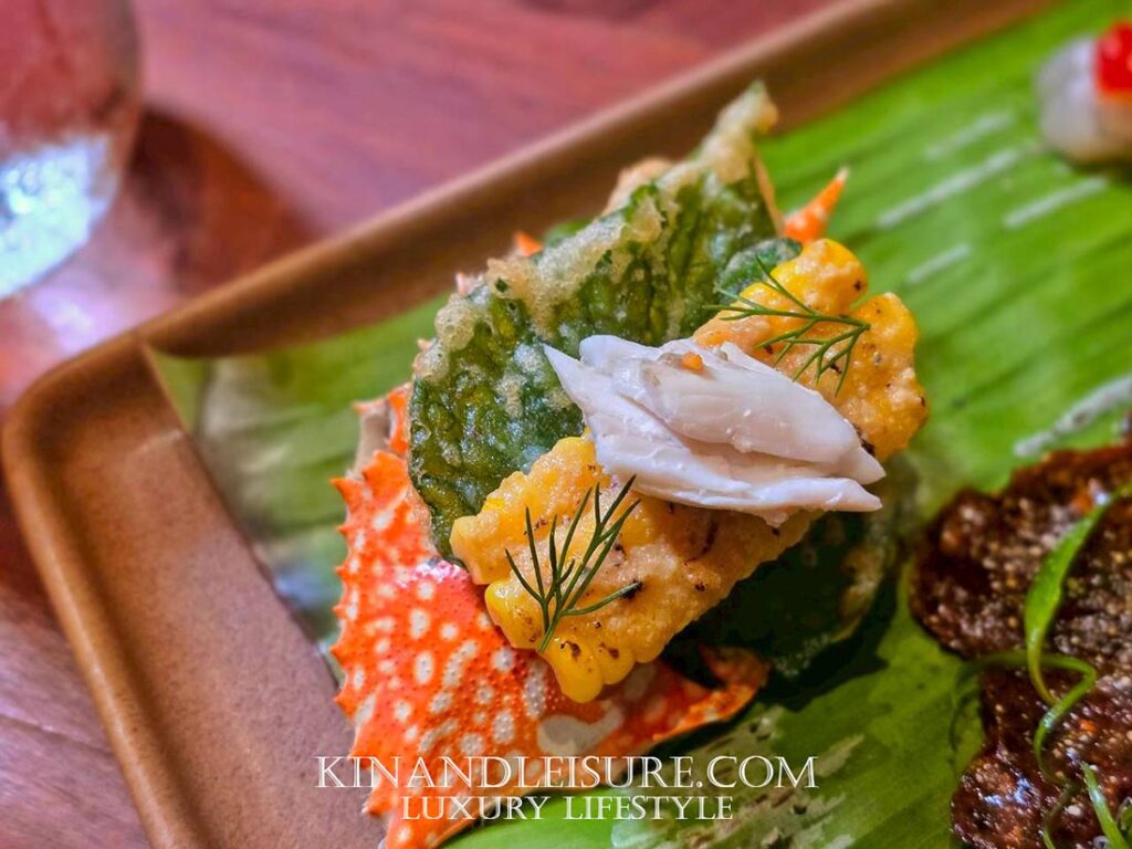 - 🌽 คำนี้คือความหอมนุ่มนวลที่มาตัดรสจัดจ้าน สลัดข้าวโพดหวานฉ่ำที่ผสมผสานกับ “มันปูนา” สีเหลืองนวล (ตามภาพมีเนื้อปู/ครีมสีขาวนวลอยู่ด้านบน อาจเป็นส่วนผสมของมันปูหรือเนื้อปู) ซึ่งมอบมิติของ รสอูมามิที่นุ่มนวล (Creamy Umami) และกลิ่นไอของท้องทุ่งนา การวางองค์ประกอบนี้ลงบน “ใบชะพลูทอดกรอบรูปทรงกระดองปู” เป็นความชาญฉลาดทางศิลปะอาหาร นอกจากจะเพิ่มความหอมและสัมผัสกรุบกรอบแล้ว ยังเชื่อมโยงจินตนาการไปยังแหล่งที่มาของส่วนผสมอย่างสมบูรณ์แบบ ยอดอ่อนผักชีลาว (Dill) ที่ประดับเพิ่มกลิ่นหอมสดชื่นและมิติสีเขียวที่ซับซ้อน