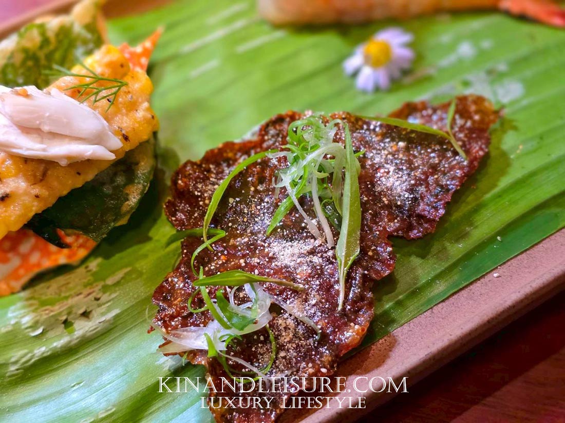 คำแรกที่เรียกน้ำย่อยคือ “ข้าวเกรียบใบหูเสือ” หรือ “อีสานออริกาโน” สัมผัสแรกคือความกรอบฟูของข้าวเกรียบที่หอมกลิ่นสมุนไพรชัดเจน แต่เนื้อสัมผัสด้านในที่แอบซ่อนความหนึบเหนียวเล็กน้อยไว้ ความขมนิด ๆ ช่วยให้อยากอาหาร เป็นการเปิดต่อมรับรสที่ชาญฉลาด