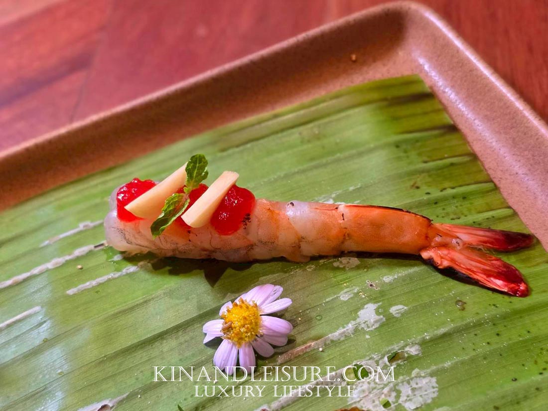 - 🦐 ปิดท้ายด้วยความสง่างามของโปรตีนชั้นเลิศ กุ้งทะเลขนาดใหญ่ (Prawn) ที่ถูกลวก/แช่เย็นจนเนื้อแน่นเด้ง (Pristine Texture) รสชาติของ “ก้อย” ถูกปรับให้มีความประณีตและสะอาดกว่าก้อยแบบดั้งเดิม เน้นความหวานตามธรรมชาติของกุ้งและรสเปรี้ยวนำที่สะอาด (Clean Acidity) เครื่องเคียงสีแดง-เหลือง ที่ท็อปด้านบน (อาจจะเป็นมะเขือเทศดอง, พริกชี้ฟ้า, หรือกระเทียมดองน้ำผึ้งตามที่ระบุ) คือการสร้าง “จุดโฟกัสรสชาติ” ที่ทำหน้าที่เป็นตัวตัดรส (Palate Cleanser) เพื่อเตรียมปากสำหรับคำต่อไป ความหวานอมเปรี้ยวและกลิ่นหอมฉุนอ่อนๆ คือการปิดฉากที่สง่างามและทันสมัย