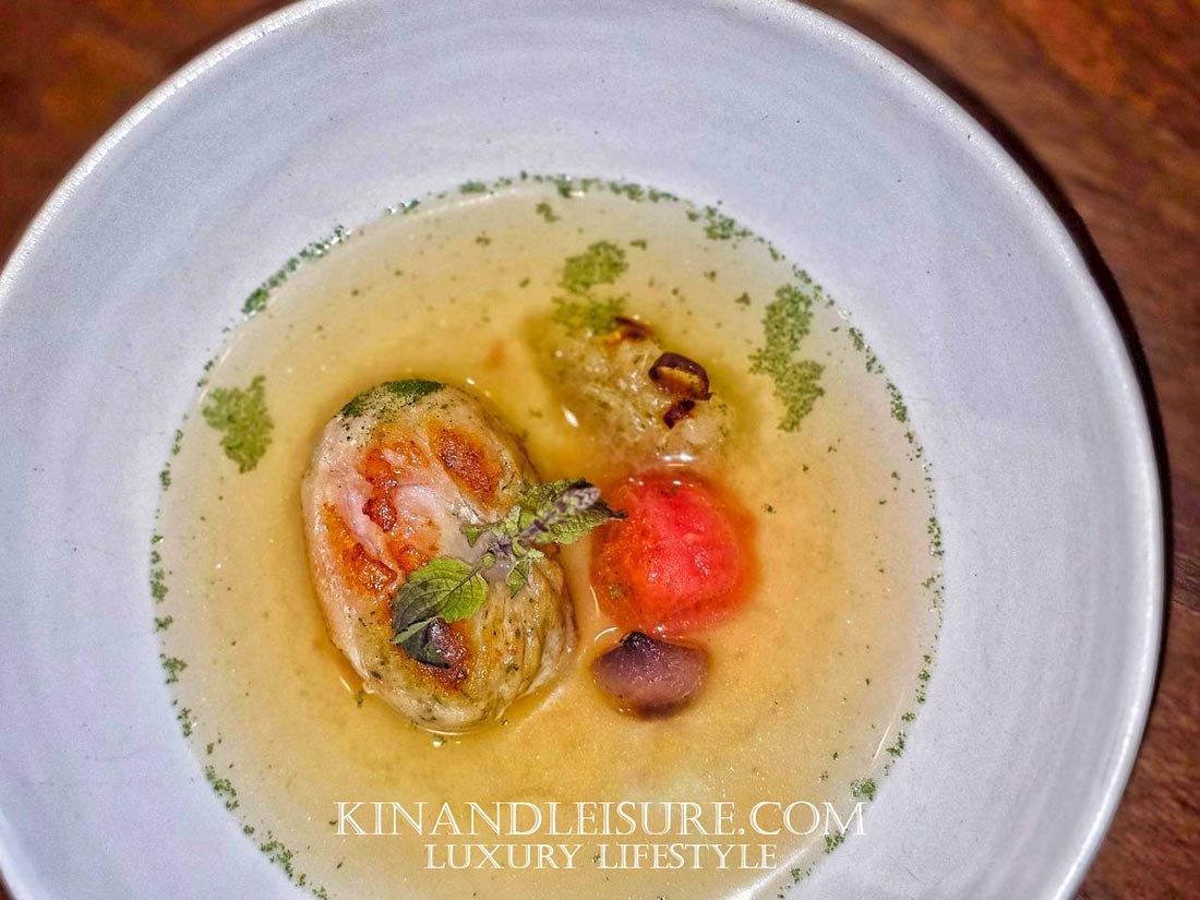 ล้างปากด้วย “ต้มแซ่บ” หรือต้มยำสไตล์อีสาน แต่เป็นต้มแซ่บที่ใสและพิถีพิถัน (ตามภาพที่กำลังรินซุป) ไฮไลท์คือ “ไก่ม้วน” พร้อม “paste ต้มแซ่บ” และมี “ใบหม่อน” เป็นจุดเด่น เมื่อซุปไก่ที่เคี่ยวจนได้ที่ถูกรินลงไป กลิ่นหอมก็อบอวล เนื้อไก่ม้วนนั้นนุ่มเด้งฉ่ำอย่างไม่น่าเชื่อ และมีกลิ่นหอมจากการย่างที่ผิวด้านนอกที่กรอบ เข้ากับเนื้อนุ่มด้านใน ซุปรสชาติกลมกล่อม เปรี้ยวเค็มเผ็ดอย่างผู้ดี
