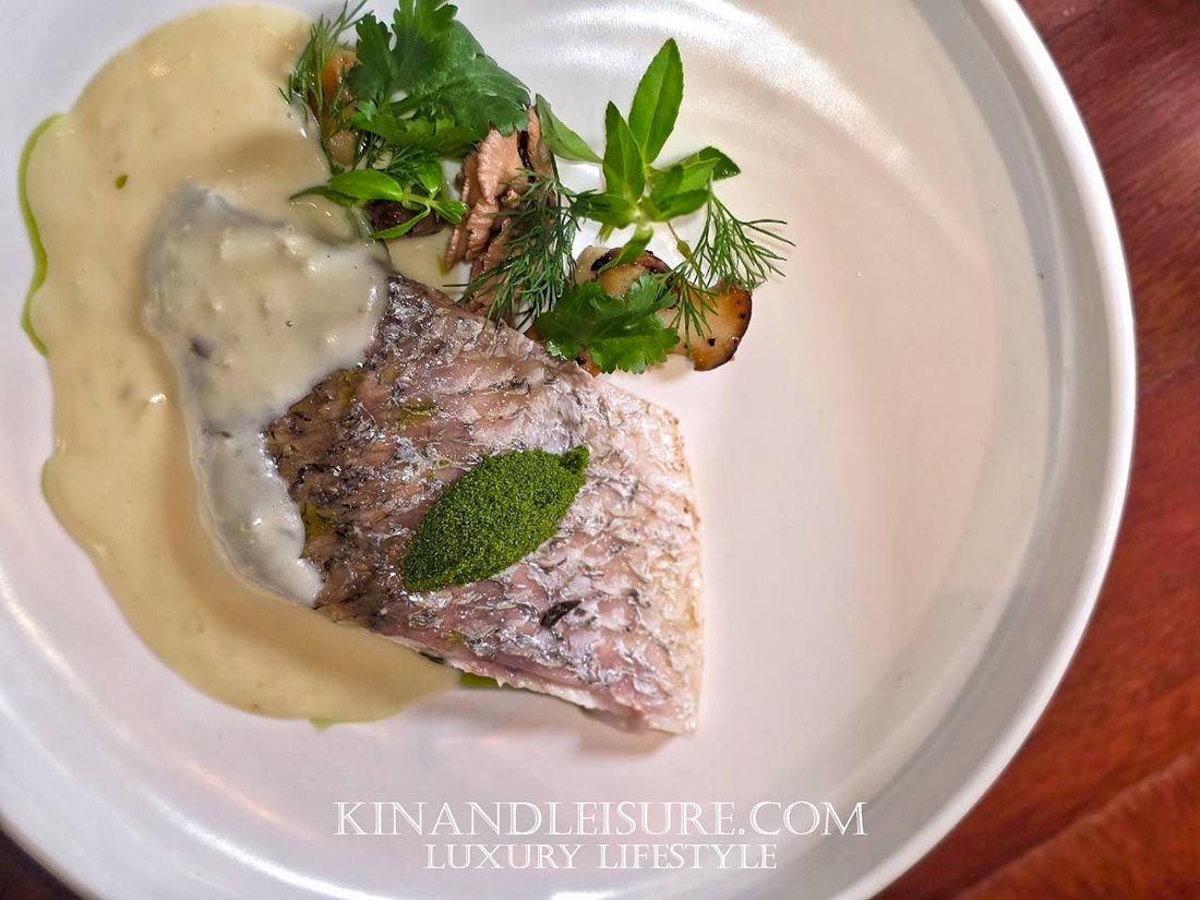 จานหลักคือ “ปลากะพงย่างเกลือ” ที่ย่างมาอย่างสมบูรณ์แบบ หนังกรอบ เนื้อในยังฉ่ำหวาน ท็อปด้วย “ไข่ผำ” (Water-meal) ซูเปอร์ฟู้ดของอีสาน เสิร์ฟเคียงกับเห็ดย่างและเห็ดดอง ราดด้วย”ซอสเบลอบอง” ที่ทางร้านดัดแปลงโดยมีวัตถุดิบลับคือ “เหล้ากลั่นคูน” จากภาคอีสาน ซึ่งช่วยชูรสชาติของซอสให้เข้มข้น มีมิติ และหอมเป็นเอกลักษณ์ โดย “คูน” เป็นแบรนด์สุราชุมชน (Craft Spirit) ที่ผลิตจาก ข้าวเหนียวอินทรีย์ ในจังหวัดขอนแก่น (ซึ่งเป็นจังหวัดต้นกำเนิดของร้าน ‘แก่น’) เกิดจากการรวมตัวของคนในชุมชนที่ต้องการเพิ่มมูลค่าให้กับข้าวในท้องถิ่น โดยนำมาผ่านกระบวนการหมักและกลั่นอย่างพิถีพิถัน บางครั้งมีการนำผลไม้หรือสมุนไพรท้องถิ่นมาใช้ร่วมด้วย การที่ร้านแก่นกรุงใช้เหล้าคูนก็เป็นการเคารพและของดีภาคอีสานอีกหนึ่งอย่าง