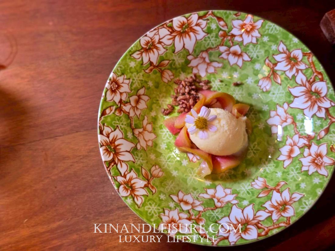 ปิดท้ายมื้ออย่างสดชื่นด้วย “ซอร์เบทสัปปะรดโยเกิร์ต” รสเปรี้ยวหวานลงตัว ทานคู่กับ “ฝรั่งตุ๋นสาโท” ที่นำสาโทจากช่วงต้นมาใช้ได้อย่างชาญฉลาด 4และเพิ่มความกบกรอบด้วย “ข้าวทับทิมชุมแพกรบ” เป็นการจบมื้อที่สมบูรณ์แบบ