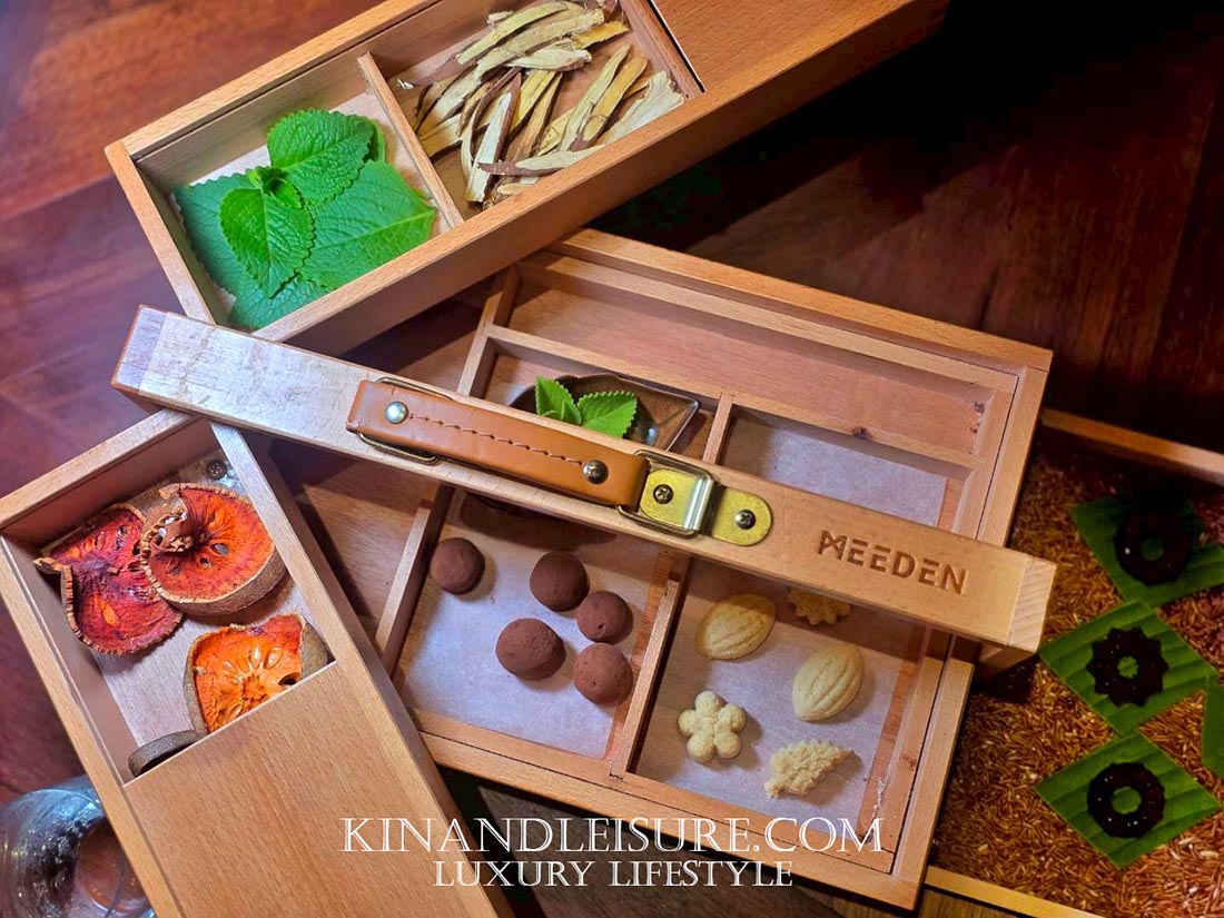 ความประทับใจยังไม่จบสิ้น “Petite four” ถูกเสิร์ฟมาในกล่องไม้ที่สวยงาม ภายในบรรจุของดีจากอีสาน ทั้ง “Jelly สาโท”, “Shortbread ลูกกระบก” ลูกกระบกหรือที่เรียกว่าอัลมอนด์อีสาน และ “Chocolate Truffle” ที่สอดไส้ “เหล้าคูน” ทานคู่กับ “ชามะตูม” ที่เบลนด์พิเศษกับ “ชะเอม” และ “ใบหูเสือ” ช่วยให้ผ่อนคลายและชุ่มคอ