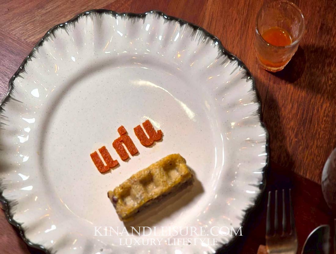 มื้ออาหารเปิดฉากอย่างแท้จริงด้วย “แจ่วบักเลน” (บักเลน หรือ มะเขือเทศในภาษาอีสาน) แต่ความพิเศษคือการนำมะเขือเทศไปย่างไฟก่อนเพื่อดึงความหอมและรสชาติที่ลึกขึ้น เสิร์ฟมาอย่างวิจิตรบนจานที่โรยผงเครื่องเทศเป็นคำว่า “แก่น” (ตามภาพ) ทานคู่กับ “วาเฟิลข้าวจี่” ที่ประยุกต์ข้าวจี่แบบดั้งเดิมให้ทันสมัยขึ้น และปิดท้ายด้วยการดื่ม “ชอตแจ่วบักเลน” ที่เสิร์ฟมาคู่กัน เป็นการระเบิดรสชาติเผ็ดร้อนที่ซับซ้อนและปลุกเร้าทุกประสาทสัมผัส