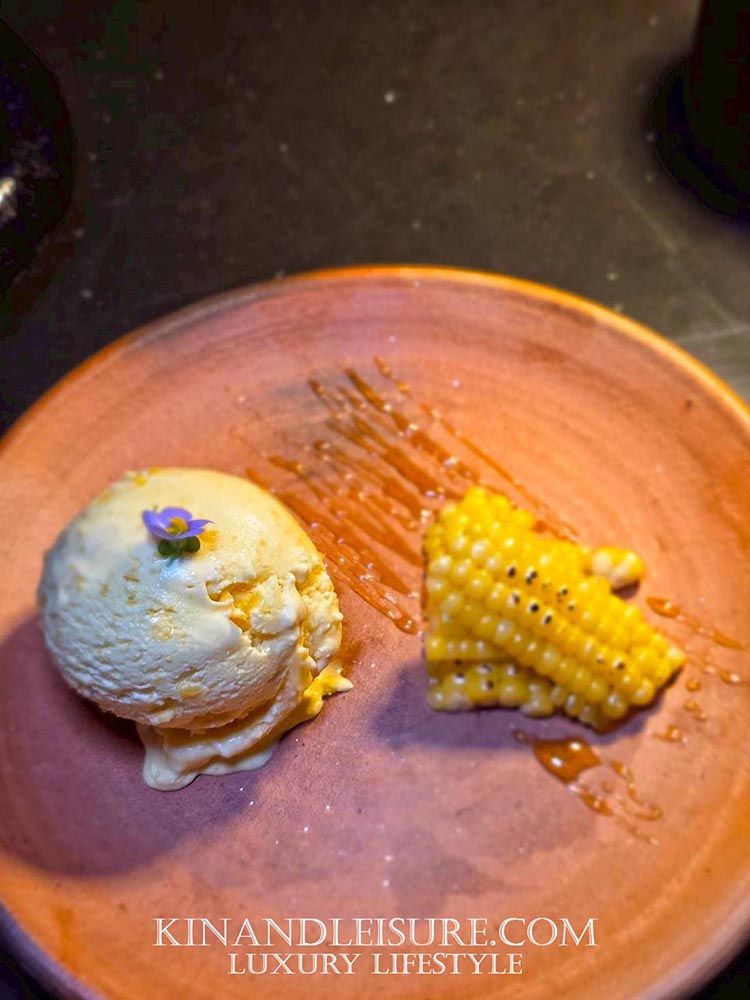 ข้าวโพดเทียนพันธุ์พื้นเมืองที่เด่นเรื่องความเหนียวนุ่ม (Glutinous Corn) นำไปย่างจนเมล็ดข้าวโพดส่งกลิ่นหอมและมีรอยเกรียมจากไฟ (Charred) เคลือบด้วยน้ำผึ้งดอกลำไยจากทางเหนือที่ให้กลิ่นหอมของเกสรดอกไม้ที่เป็นเอกลักษณ์ ทานคู่กับ ไอศกรีมข้าวโพดย่าง (Toasted Corn Ice Cream) ที่เชฟใส่ใจถึงขั้นนำข้าวโพดไปย่างก่อนจะนำมาทำไอศกรีม เพื่อให้ได้รสสัมผัส Smoky ที่ชัดเจน เมนูนี้คือการเฉลิมฉลองให้กับผลผลิตทางการเกษตรของไทยอย่างแท้จริง