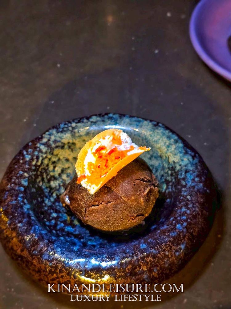 นี่คือการเปลี่ยนเมนูสตรีทฟู้ดให้กลายเป็นงานศิลปะ ขนมครกกะทิสดที่ทำขึ้นใหม่แบบจานต่อจาน ผิวนอกกรอบและไส้ในไหลเยิ้ม (Lava texture) ทานคู่กับไอศกรีม Salted Caramel Peanut หรือที่คนไทยคุ้นเคยในชื่อ “ไอศกรีมถั่วตัด” ที่ให้รสชาติหวานเค็มตัดกันอย่างลงตัว เพิ่มความสดชื่นด้วย ซอสมัลเบอร์รี่ (Mulberry Sauce) รสเปรี้ยวอมหวานที่ช่วยลดความเข้มข้นของกะทิ ทำให้ขนมจานนี้ทานได้เรื่อยๆ โดยไม่รู้สึกเลี่ยน เป็นความลุ่มลึกที่แฝงอยู่ในความคุ้นเคย