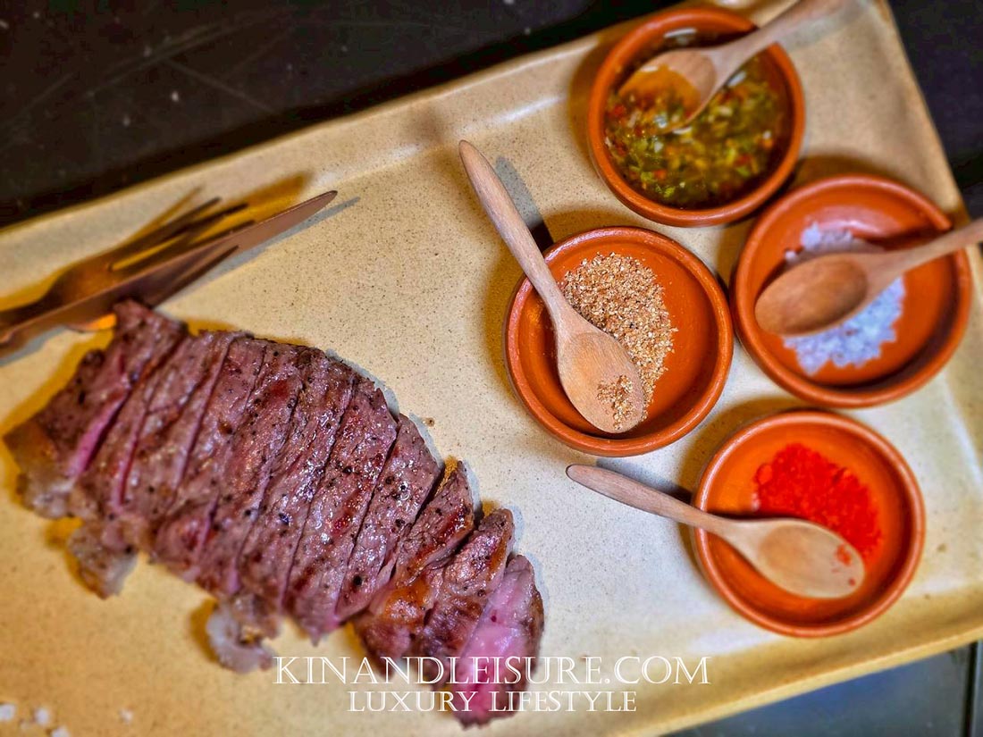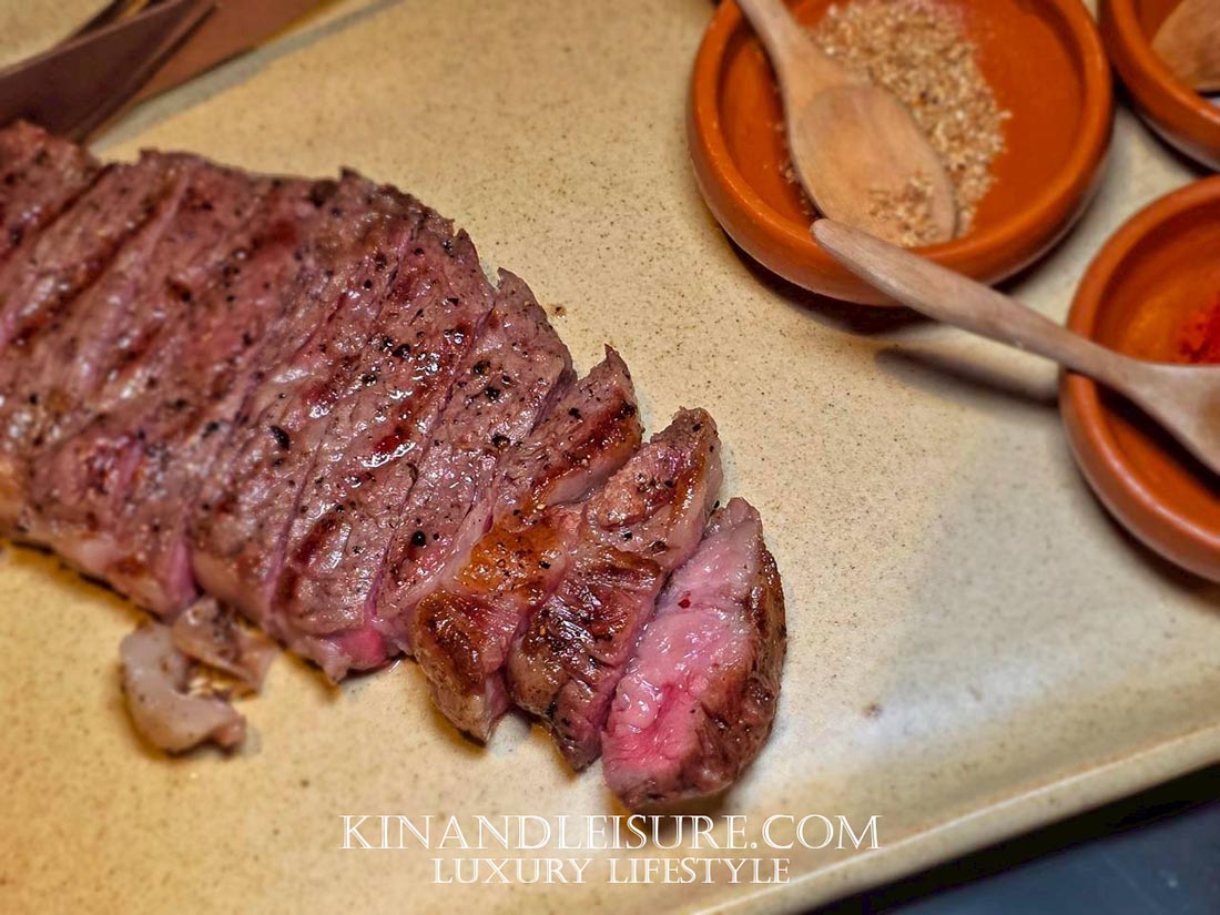 เชฟยกระดับมิติของรสชาติด้วยการหมักเครื่อง น้ำพริกตาแดงสูตรคุณยายจากนครสวรรค์ (Grandma Chilli-Marination) ซึ่งเป็นภูมิปัญญาในการดึงความหวานของเนื้อออกมาผ่านความเผ็ดร้อนและเปรี้ยวนวล เมื่อนำลงย่างบนเตาฟืน กลิ่นพริกแกงและไขมันวากิวที่โดนไฟจะสร้างความหอมที่รุนแรงและเย้ายวนใจ จัดเสิร์ฟมาในขนาด 200 กรัมที่พอเหมาะสำหรับการแบ่งปันความสุขบนโต๊ะอาหาร