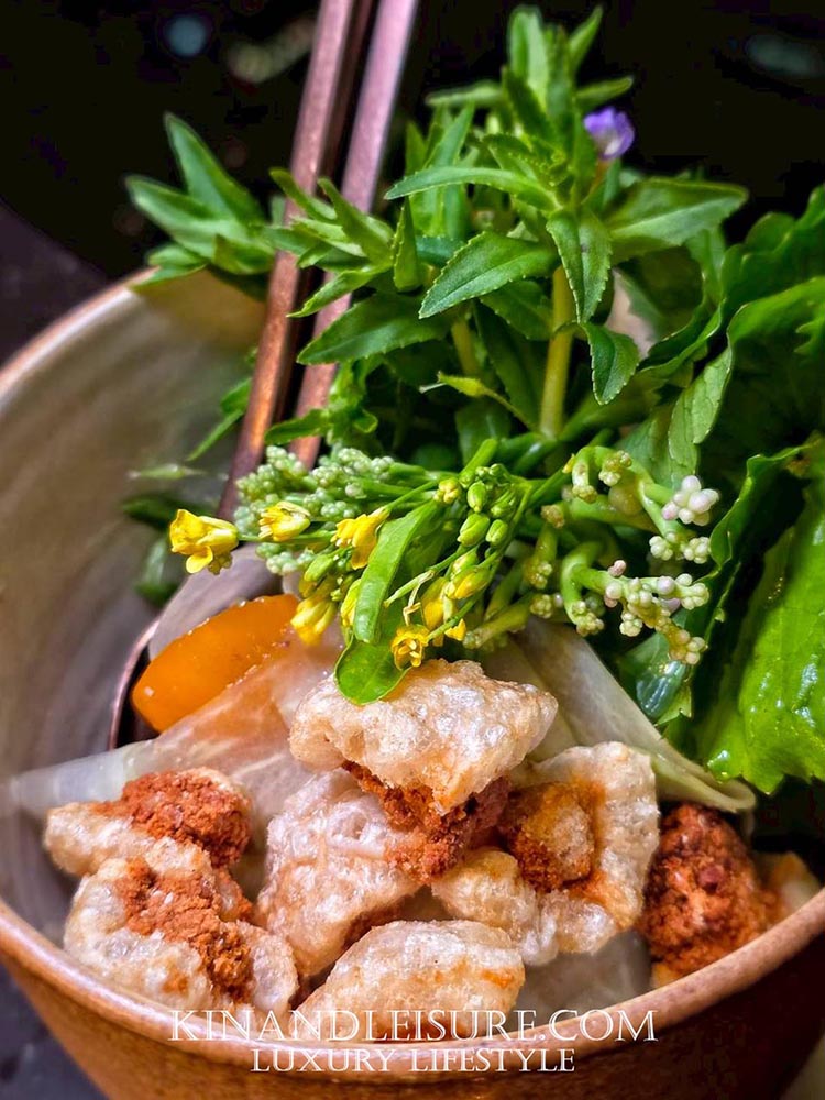 ซึ่งเป็นการลดขยะอาหาร (Food Waste) โดยนำผักตามฤดูกาลมาสร้างสรรค์ใหม่ ในชุดประกอบด้วยความลุ่มลึกของ กิมจิไทยดองน้ำซาวข้าว ที่ให้รสเปรี้ยวสะอาด, ขนุนอ่อนดองพริกแกง ที่ให้สัมผัสเนื้อสัมผัสคล้ายเนื้อสัตว์และรสเผ็ดอ่อนๆ, มะเขือเทศแฟนซีดองกับข่าอ่อน ที่ระเบิดความสดชื่นในปาก