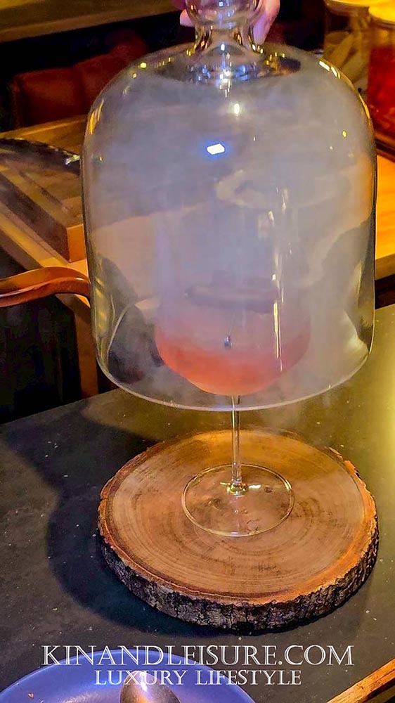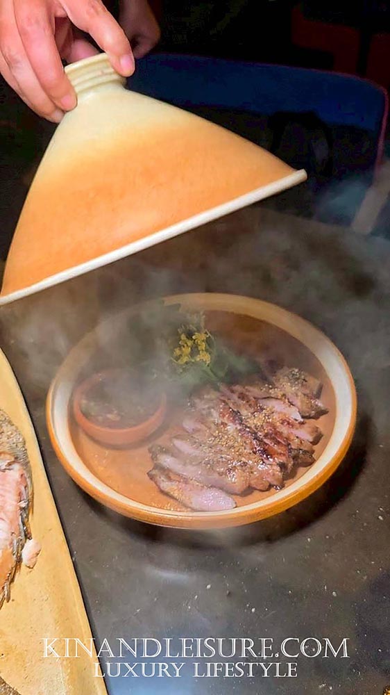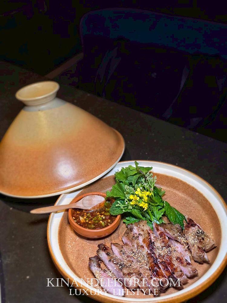 สัมผัสประสบการณ์แห่ง “ควันไฟ” (Smoke) อย่างเต็มรูปแบบด้วยเมนูคอหมูย่างที่มาพร้อมกับการพรีเซนต์อันน่าตื่นตา พนักงานจะนำจานที่มีฝาครอบดินเผาทรงสูงมาวาง เมื่อเปิดฝาออก กลิ่นหอมหวานอันเป็นเอกลักษณ์ของ ควันไม้ลำไย จะพวยพุ่งออกมาคลุมไปทั่วโต๊ะ