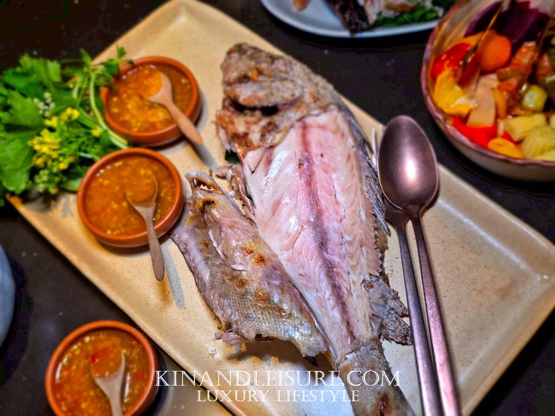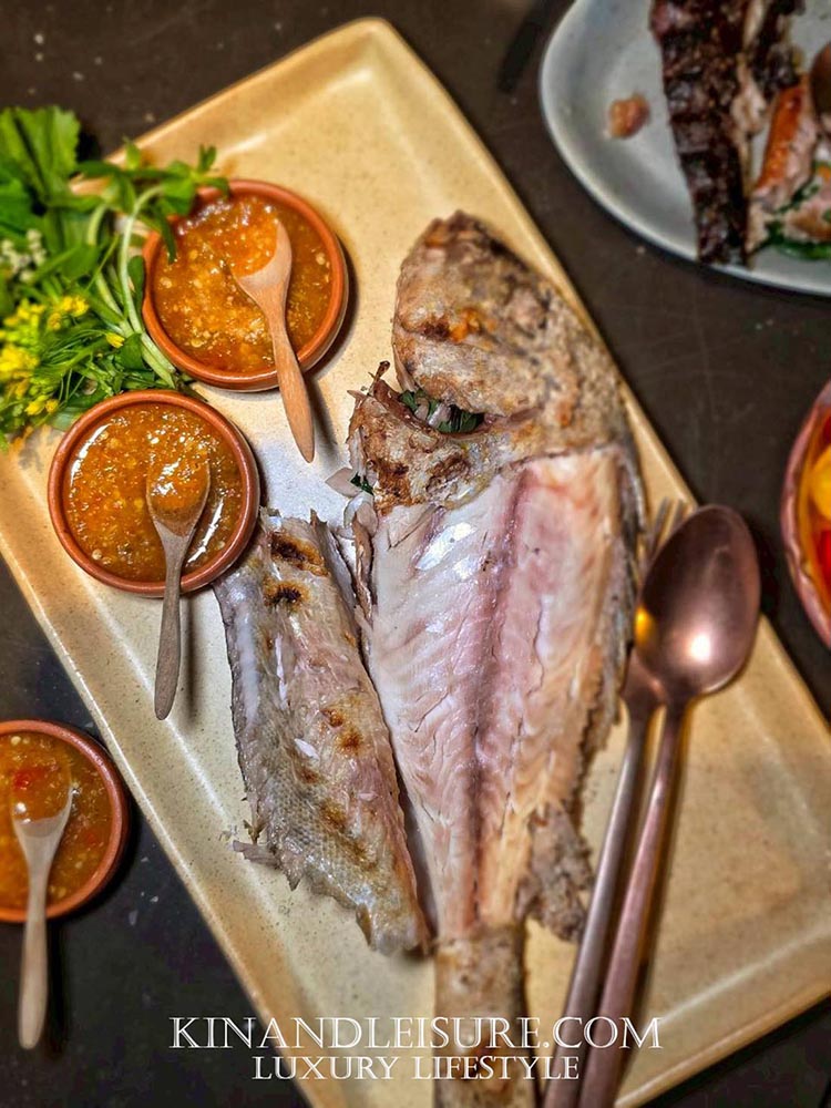 หนังปลาถูกย่างจนกรอบและมีกลิ่นหอมจากถ่านไม้ ขณะที่เนื้อด้านในยังคงความเด้งและสดประหนึ่งเพิ่งขึ้นจากเรือประมงไทย เป็นเมนูที่สะท้อนถึงแนวคิดความยั่งยืนและการเลือกใช้วัตถุดิบพื้นถิ่นได้อย่างสง่างาม