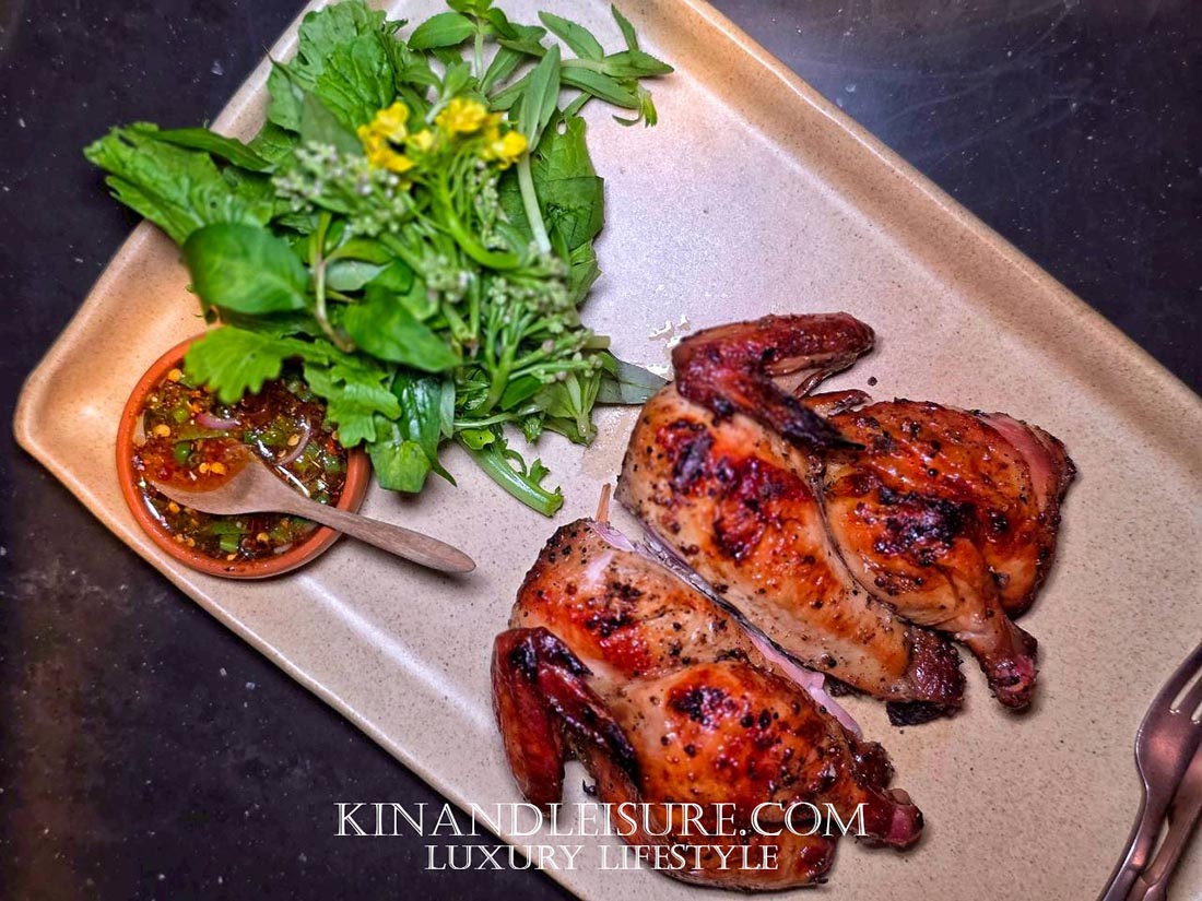 ทานคู่กับน้ำจิ้มแจ่วสูตรเฉพาะและผักสดพื้นบ้าน เป็นการผสมผสานระหว่างเทคนิคการปรุงพื้นบ้านเข้ากับวัตถุดิบเชิงพาณิชย์ที่มีจริยธรรม (Ethical Sourcing) อย่างแท้จริง