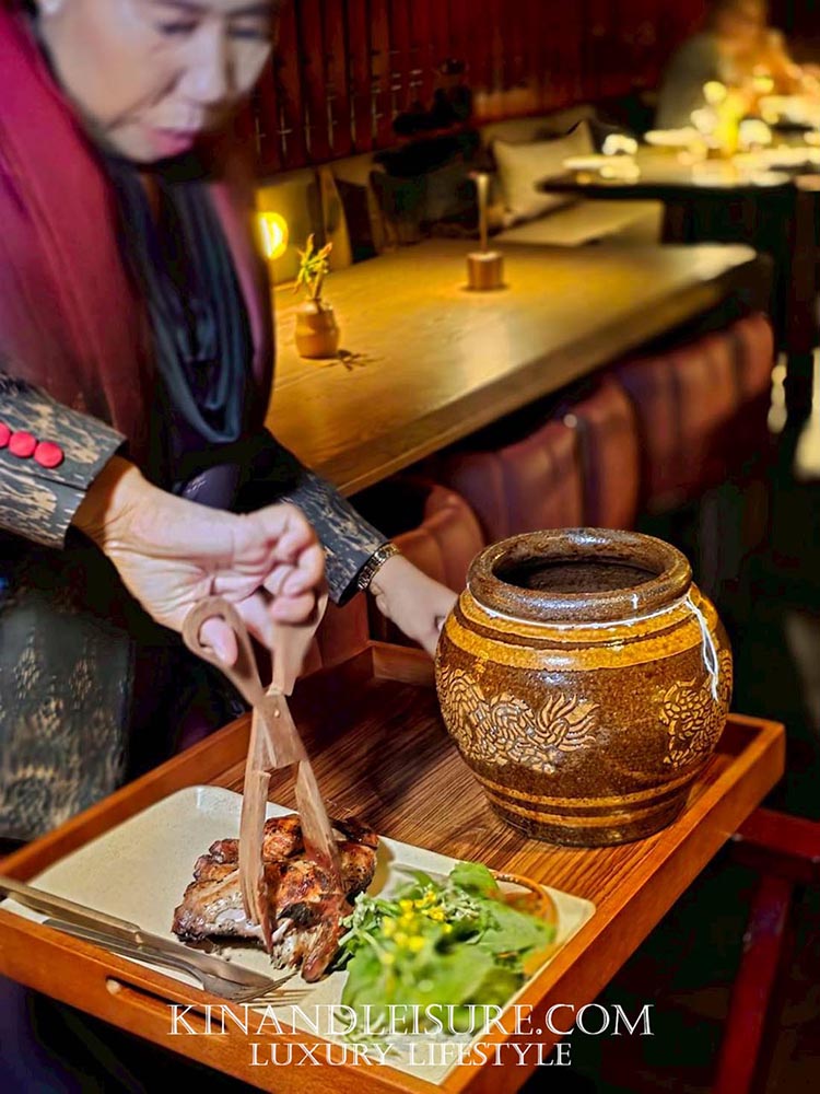พนักงานจะทำการโชว์เทคนิคการจุดไฟบนปากโอ่งเพื่อสร้างกลิ่นหอมและอุณหภูมิสุดท้ายก่อนเสิร์ฟ เมื่อคีบไก่ออกมาจะพบกับหนังที่บางกรอบและเนื้อที่สุกพอดีอย่างน่าอัศจรรย์