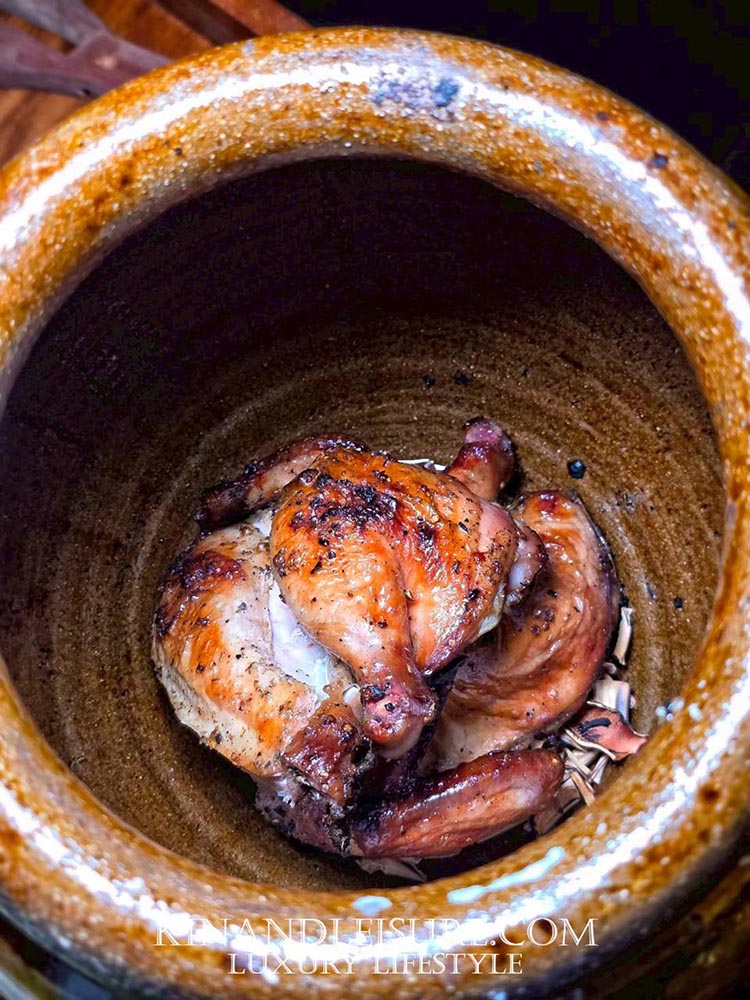 เมนูซิกเนเจอร์ที่ได้รับแรงบันดาลใจจากวิถีชีวิตชาวบ้านภาคกลางและอีสาน โดยเลือกใช้ไก่สายพันธุ์พิเศษจาก คลองไผ่ฟาร์ม จ.นครราชสีมา ที่มีอายุเพียง 21 วัน เพื่อให้ได้เนื้อที่นุ่มนวลที่สุดเท่าที่จะเป็นไปได้ ไก่ถูกหมักด้วยตะไคร้สดและเครื่องเทศไทยจนเข้าเนื้อ ก่อนจะนำไปอบในโอ่งดินเผาที่กักเก็บความร้อนและกลิ่นหอมไว้อย่างดี
