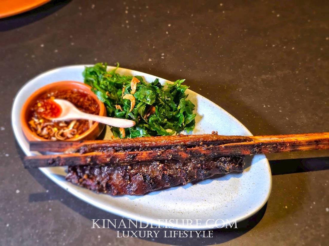 นี่คือเมนูที่พิสูจน์ว่า “ของอร่อยมักซ่อนอยู่ในส่วนที่คาดไม่ถึง” Grilled Pork Brisket Skewer หรือนมหมูย่างชิ้นนี้ ถูกคัดสรรส่วนที่มีความนุ่มและมันแทรกในสัดส่วนที่พอเหมาะ เชฟนำไปหมักด้วยเครื่องปรุงตำรับไทยก่อนจะย่างบนไฟอ่อนๆ จนไขมันเริ่มแตกตัวและส่งกลิ่นหอมไหม้ของถ่านไม้ สัมผัสแรกคือความนุ่มที่สู้ฟันเบาๆ (Chewy) รสชาติหวานนำจากความสดของวัตถุดิบและเค็มตามจากเครื่องหมัก การจัดวางมาในรูปแบบเสียบไม้พอดีคำ ทำให้ความร้อนจากเปลวไฟเข้าถึงเนื้อในอย่างทั่วถึง เป็นความเรียบง่ายที่ให้รสสัมผัสหรูหราเกินราคาไปมาก