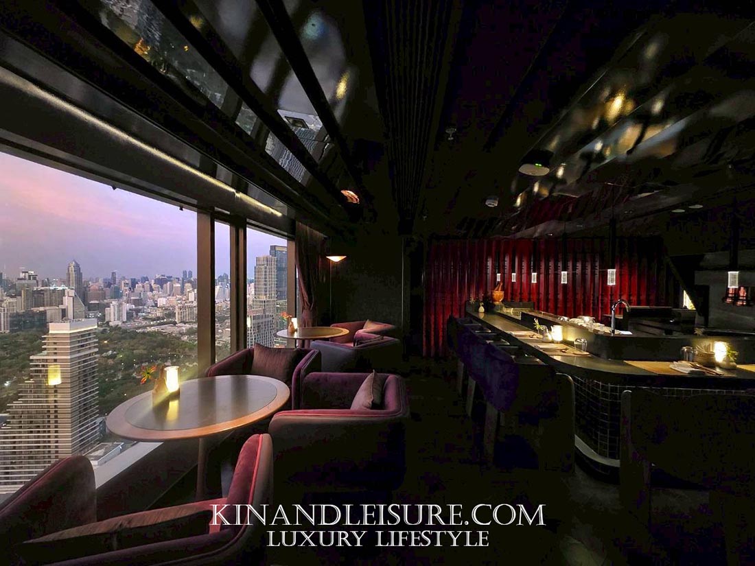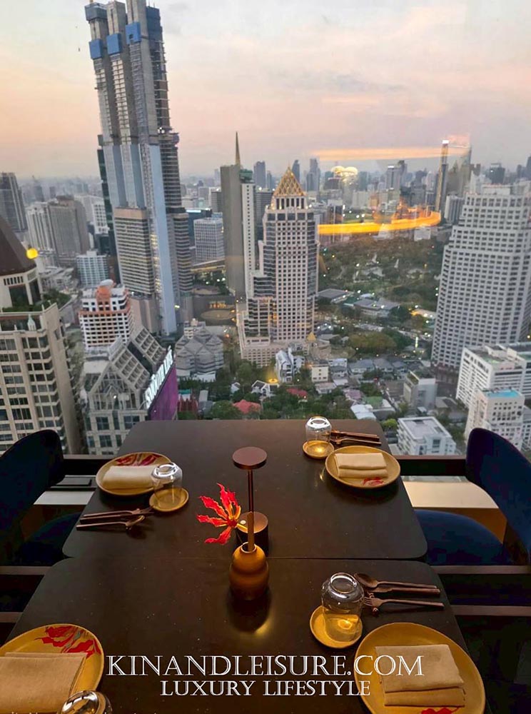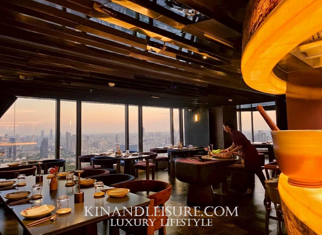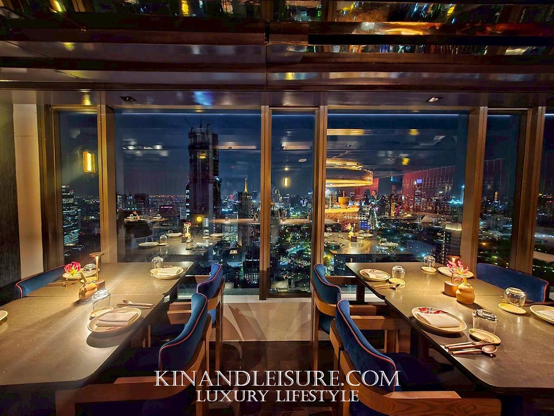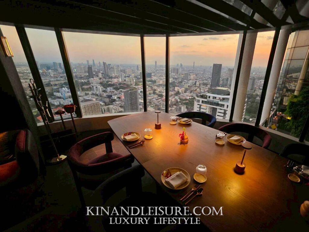 Lighting & Atmosphere (แสงและเงา): การเลือกใช้แสงสว่างแบบ Low-key Lighting ช่วยสร้างมิติให้กับพื้นที่ เพดานกระจกเงาสีเข้มช่วยสะท้อนแสงไฟจากโต๊ะอาหารและวิวเมืองกรุงเทพฯ ทำให้พื้นที่ดูสูงโปร่งและลึกลับในเวลาเดียวกัน เก้าอี้กำมะหยี่สีม่วงเข้มและน้ำเงินลึก (Royal Hue) ช่วยขับเน้นความหรูหราแบบ Modern Luxury ที่ไม่ทิ้งกลิ่นอายเอเชีย