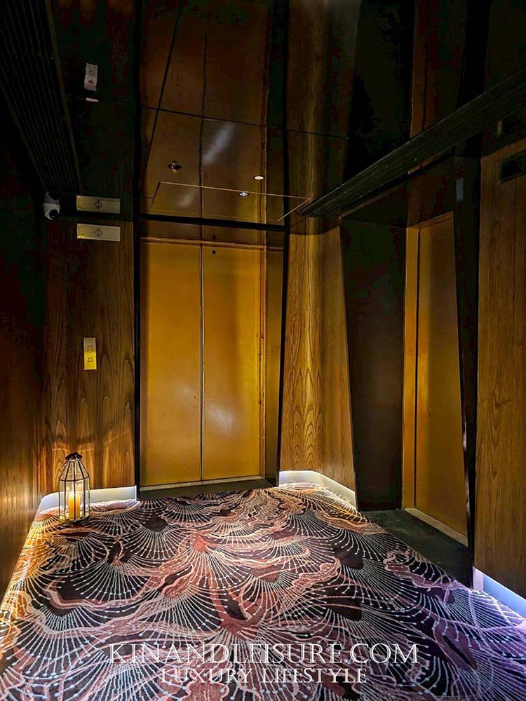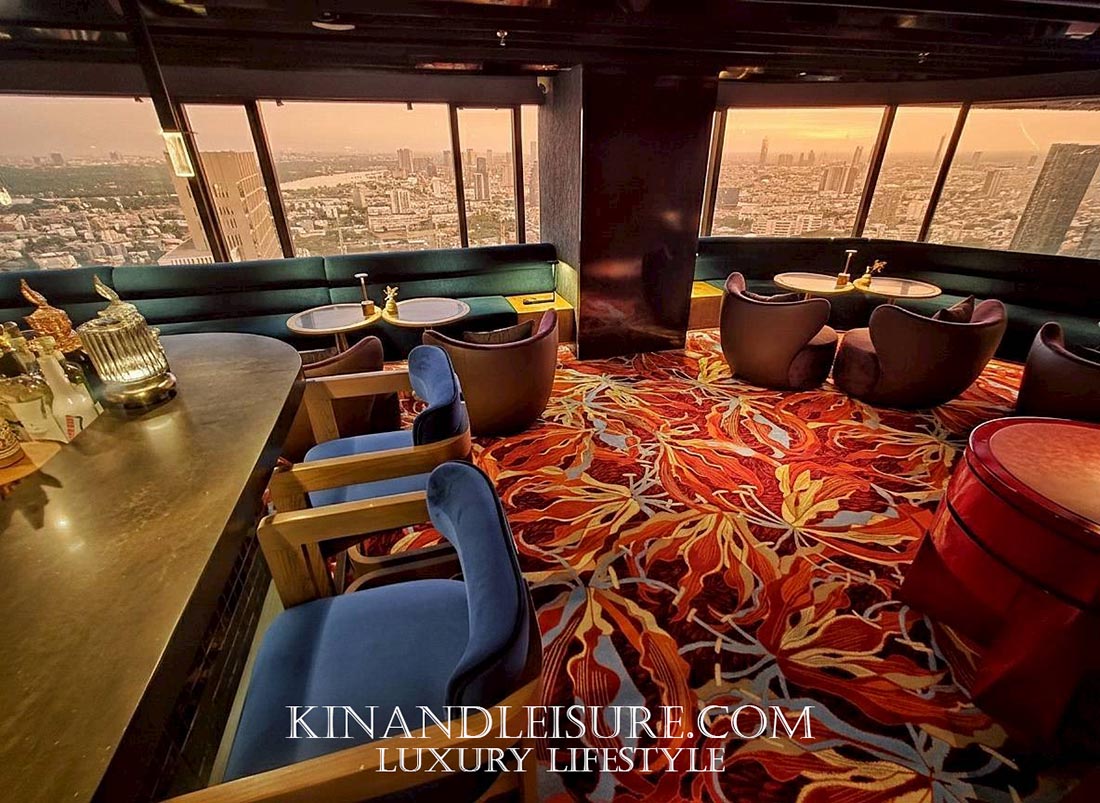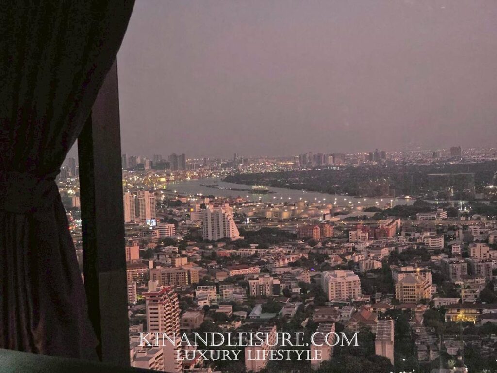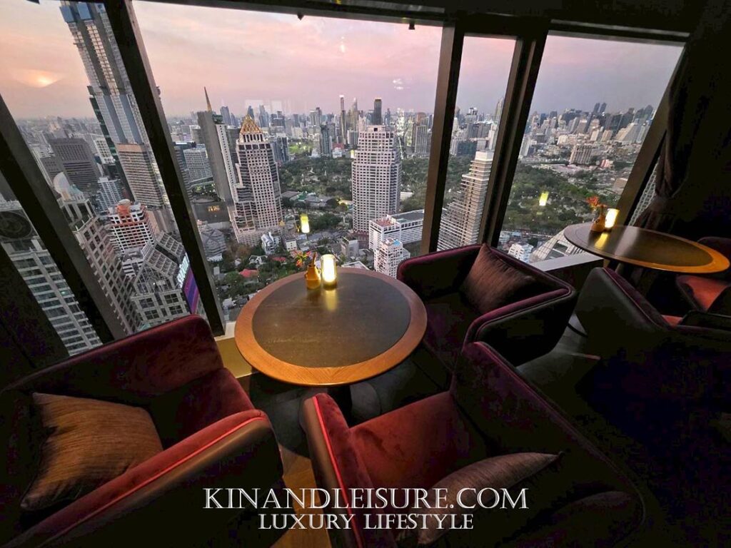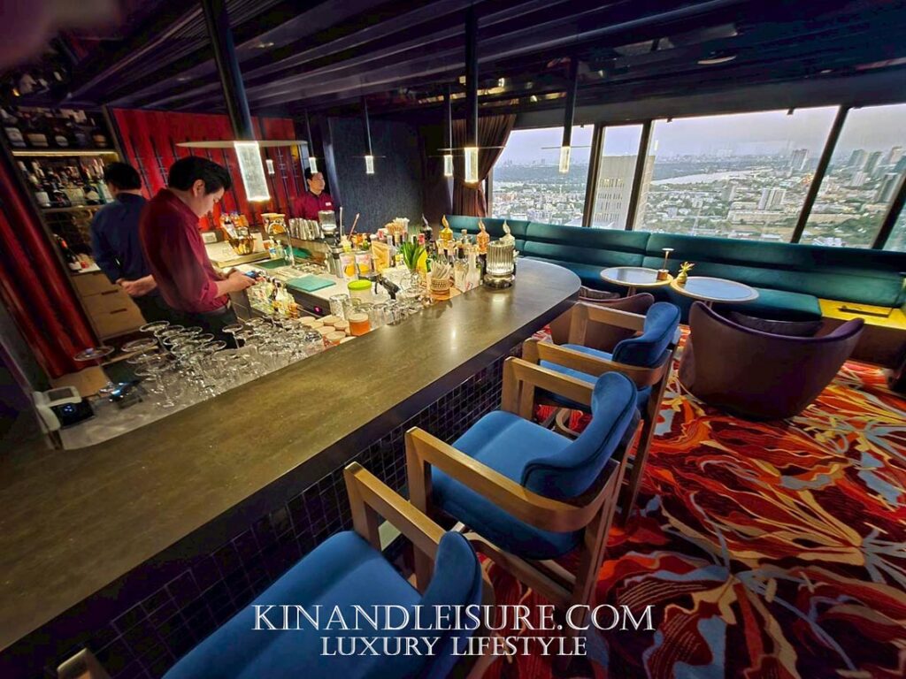 Lighting & Atmosphere (แสงและเงา): การเลือกใช้แสงสว่างแบบ Low-key Lighting ช่วยสร้างมิติให้กับพื้นที่ เพดานกระจกเงาสีเข้มช่วยสะท้อนแสงไฟจากโต๊ะอาหารและวิวเมืองกรุงเทพฯ ทำให้พื้นที่ดูสูงโปร่งและลึกลับในเวลาเดียวกัน เก้าอี้กำมะหยี่สีม่วงเข้มและน้ำเงินลึก (Royal Hue) ช่วยขับเน้นความหรูหราแบบ Modern Luxury ที่ไม่ทิ้งกลิ่นอายเอเชีย
