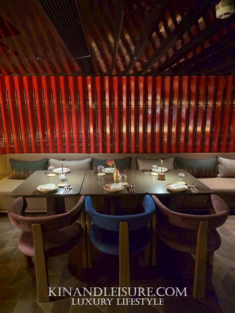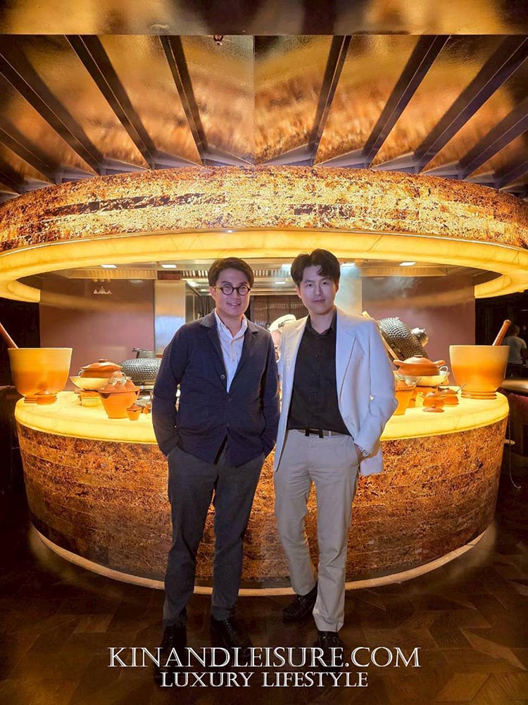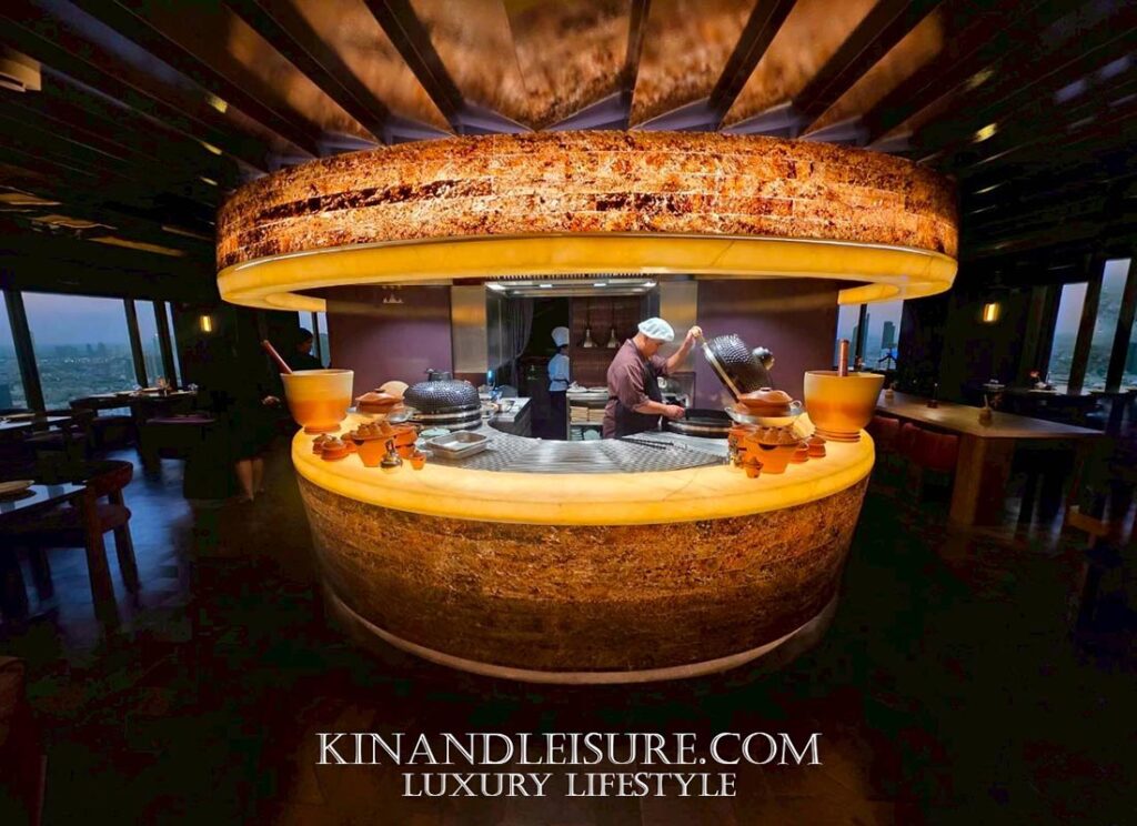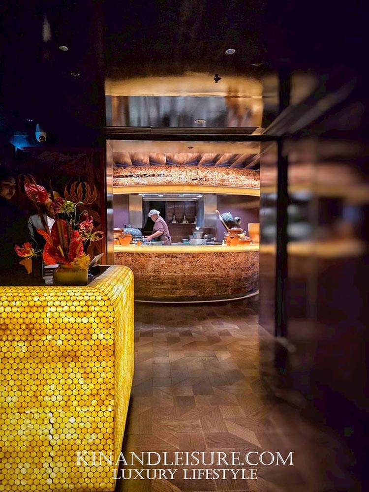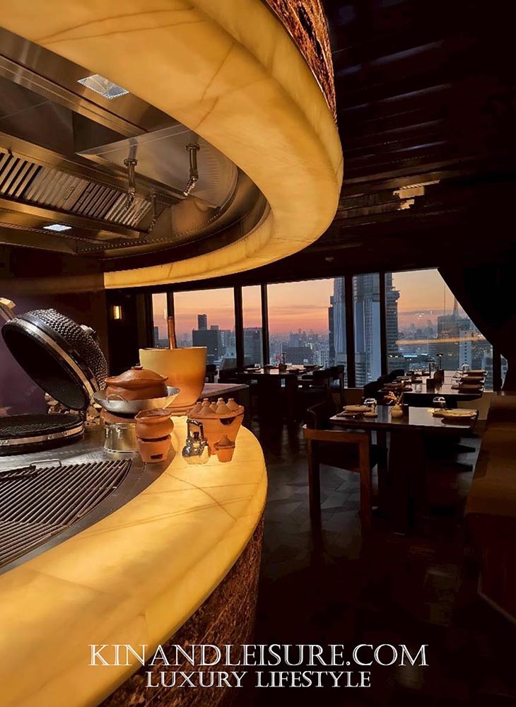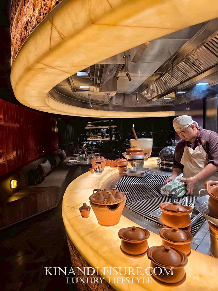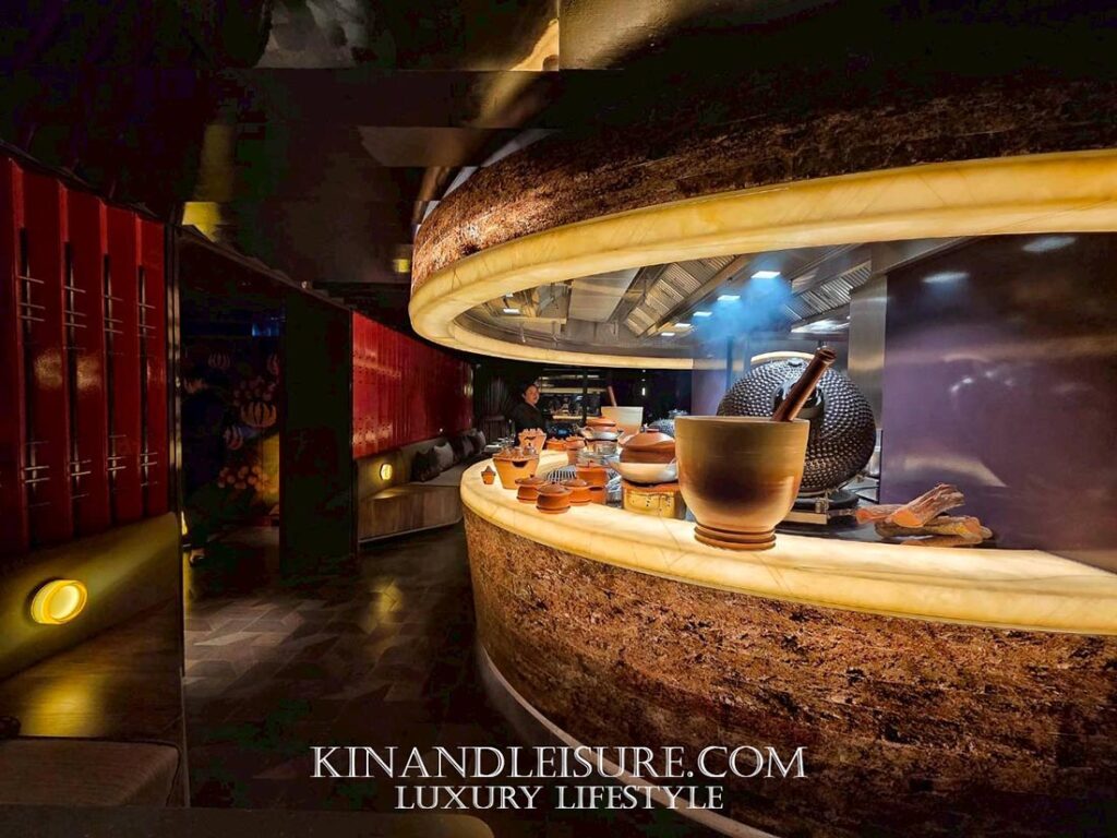 The Radiant Core (ศูนย์กลางแห่งพลัง): จุดเด่นที่สุดคือ Open Kitchen ที่ถูกออกแบบให้เป็นประติมากรรมชิ้นเอก (Centerpiece) เคาน์เตอร์ครัวทรงกลมบุด้วยหินอ่อนสีน้ำอมเหลืองที่ซ่อนไฟด้านใน (Backlit Stone) ให้ความรู้สึกเหมือนลาวาที่กำลังระอุอยู่ใต้ดิน ล้อไปกับเตาย่างทรงโดมสีดำเงาขลับและการปรุงอาหารด้วยฟืนและถ่าน (Smoke & Spice) ซึ่งถือเป็นหัวใจของครัวที่ปฏิเสธการใช้แก๊สอย่างสิ้นเชิง