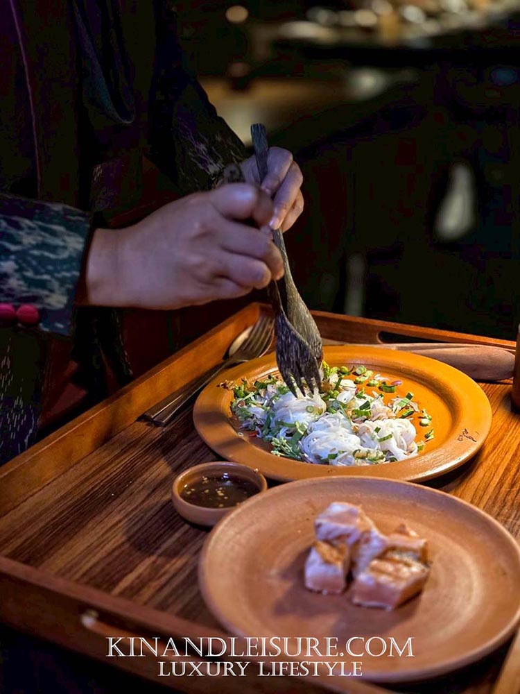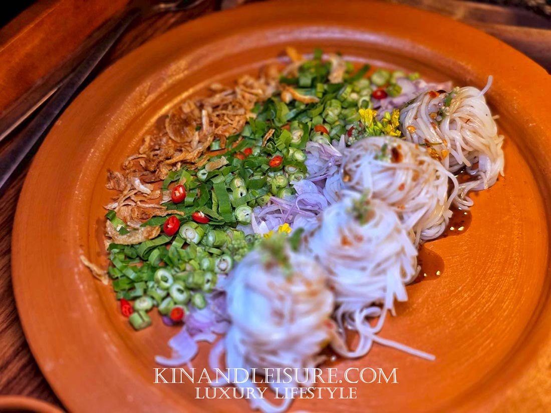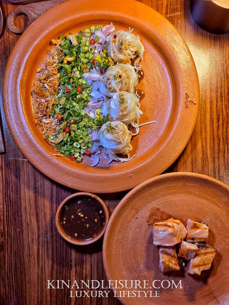 นี่คือเมนูที่ผสานศิลปะการบริการแบบ Table-side เข้ากับรสชาติจัดจ้านของอาหารอีสานได้อย่างไร้ที่ติ พนักงานจะเข็นรถมาเพื่อปรุงน้ำยำปลาร้าสูตรนัว (Thai Anchovy Dressing) ให้ชมริมโต๊ะ กลิ่นหอมของปลาร้าชั้นดีที่ผ่านการเคี่ยวจนหอมกรุ่น คลุกเคล้ากับเส้นขนมจีนสดที่เหนียวนุ่ม เพิ่มสัมผัสความกรุบกรอบจากถั่วฝักยาวซอยละเอียดและหอมแดงทอด