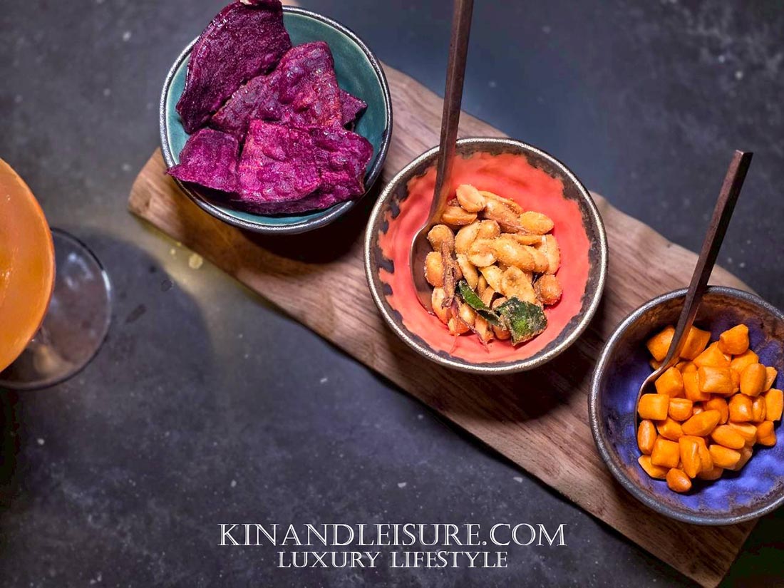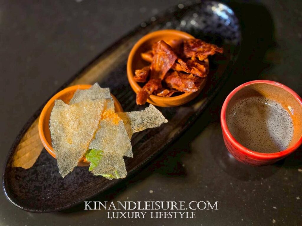 การเดินทางของรสชาติเริ่มต้นด้วย Welcome Drink & Snack ที่มีความหมายลึกซึ้ง ตัวเครื่องดื่มคือ “ข้าวหมาก” ภูมิปัญญาไทยที่ให้รสหวานหอมแบบธรรมชาติจากการหมัก หรือหากท่านไม่ดื่มแอลกอฮอล์ ทางร้านมี “น้ำจี่มะม่วง” ที่ให้รสเปรี้ยวหวานสดชื่น ปลุกความอยากอาหารได้เป็นอย่างดี ทานคู่กับพริกทอดและข้าวตังกรุบกรอบ