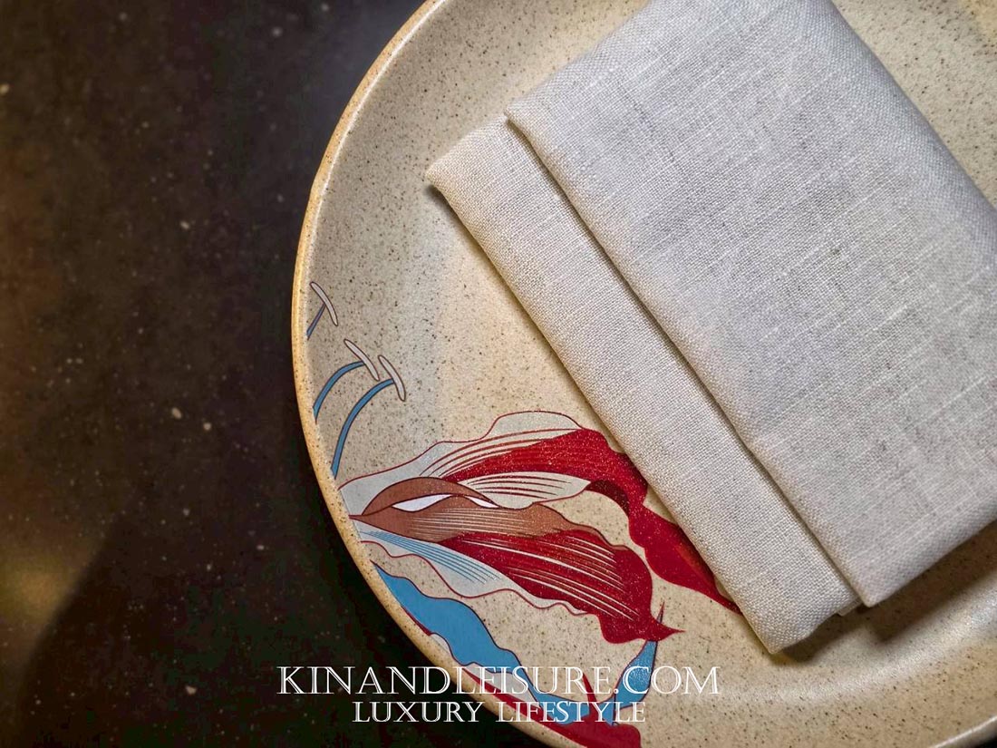 The Floral Carpet (พรมดอกไม้สั่งตัด): พื้นทางเดินถูกปูด้วยพรมทอมือลายดอกไม้สีสันจัดจ้าน (Custom-made) ที่สั่งทำพิเศษ ลวดลายนี้ไม่ได้มีไว้เพียงความสวยงาม แต่เป็นตัวเชื่อมโยงทางสายตา (Visual Link) จากพื้นไปสู่แจกันดอกไม้บนโต๊ะ และส่งต่อไปยังลวดลายบน จานอาหารที่ทำจากเปลือกหอยนางรมรีไซเคิล ซึ่งถือเป็นการออกแบบที่คำนึงถึงความยั่งยืน (Sustainability) อย่างเป็นรูปธรรม