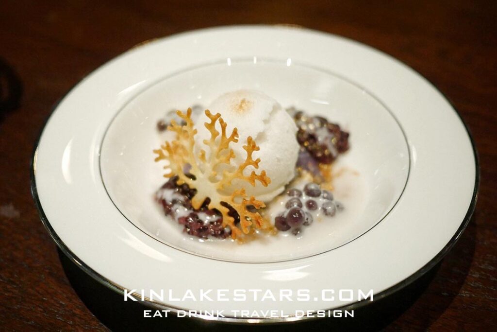 ของหวานที่เบสจากเผือกทำเป็นบัวลอยไข่มุก และเผือกกวน ข้าวเหนียวดำ รับประทานกับกะทิและไอติมกะทิ พร้อม crumble เป็นการผสมผสานของหวานแบบไทยหลายชนิด วัตถุดิบของฝรั่งได้อย่างลงตัว เป็นของหวานปิดมื้ออาหารได้ดี
