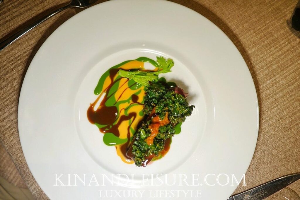 เมนคอร์สที่สมศักดิ์ศรีซึ่งจุดเด่นของจานคือซอส Italian Green Turnip และ Uni ที่ตัดกันเป็นลวดลายสวนงาม กระตุ้นความอยากอาหารได้เป็นอย่างดี เคียงข้างกับ Dry age angus tenderloin ชิ้นโต เนื้อมีความนุ่มเหนียวกำลังดี