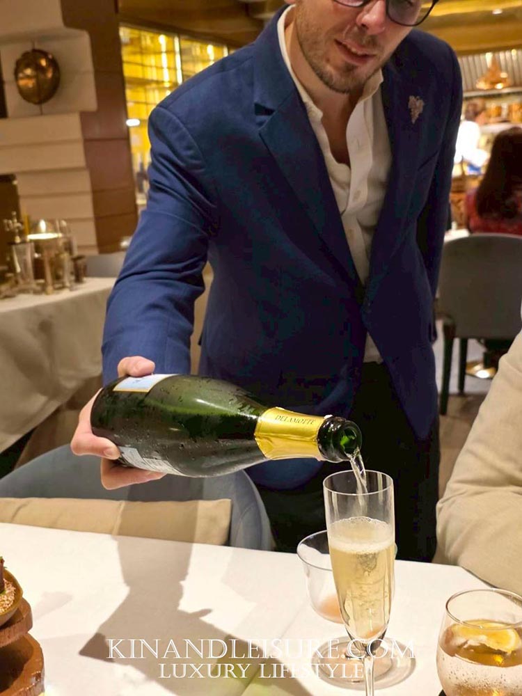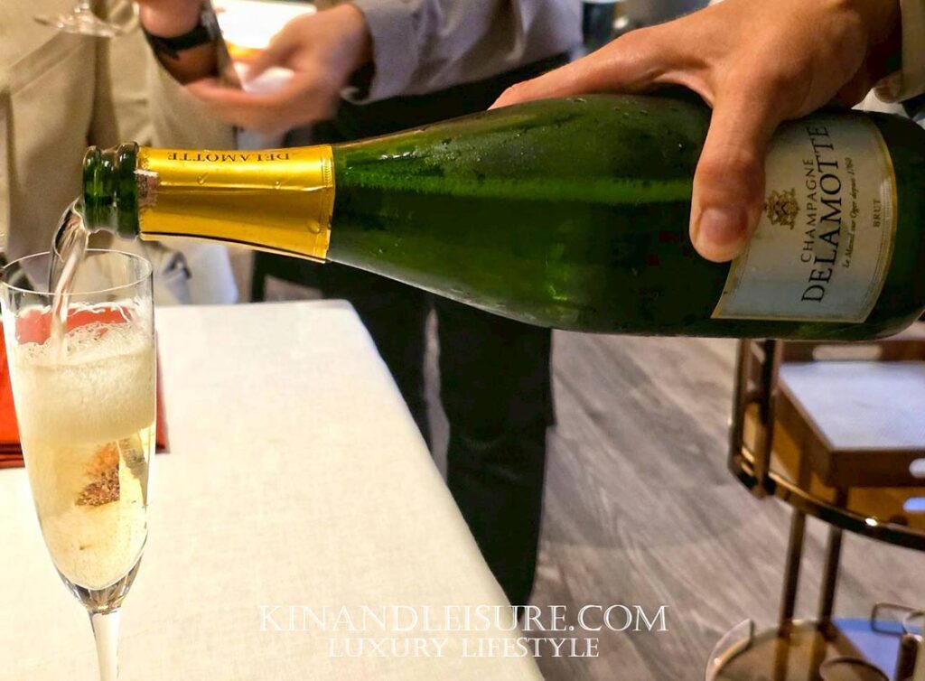 สำหรับการจับคู่สุนทรียรสในจาน ต้มข่าปลากุดสลาด Dry-Aged แบบเย็น บูมบอกเลยว่าการเลือกใช้ Champagne Delamotte Le Mesnil-sur-Oger Brut NV มาเคียงคู่กันนั้นเป็นการยกระดับมื้อนี้สู่ความสมบูรณ์แบบที่แท้จริงครับ แชมเปญขวดนี้เป็น Blanc de Blancs (ทำจาก Chardonnay 100%) ที่มีความ Dry และความสดชื่นสูงมาก โดดเด่นด้วยโน้ตของ Citrus แซมด้วยแอปเปิ้ลเขียว และมีความซับซ้อนของกลิ่นขนมปังบริยอชหอมนวลที่เกิดจากการบ่มนานถึง 36 เดือน