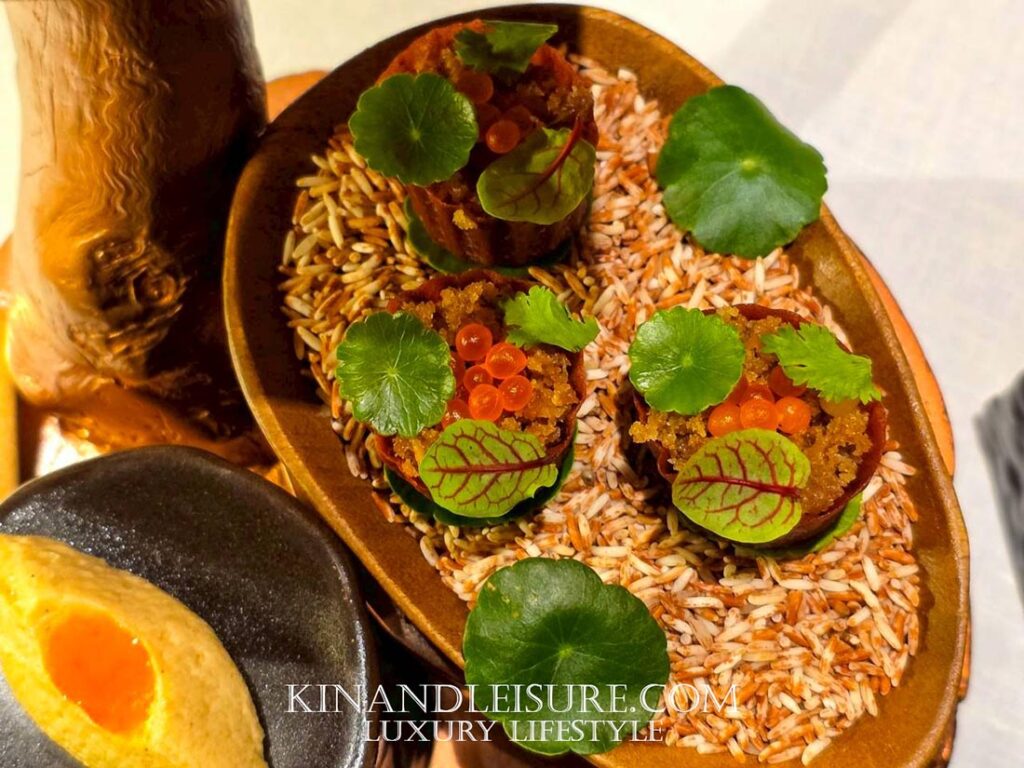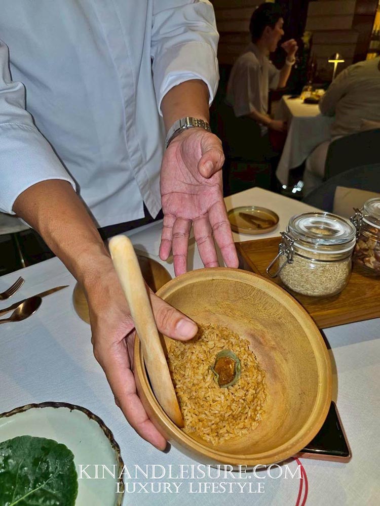 ความพิเศษที่ไม่พูดถึงไม่ได้คือองค์ประกอบของ “ข้าว” ที่เชฟภูมิเลือกใช้ ข้าวผกาอัมปึล (ข้าวดอกมะขาม) ข้าวพันธุ์พื้นเมืองจากจังหวัดสุรินทร์ที่มีความหนึบและหอมเป็นเอกลักษณ์ เสริมมิติด้วย เมล็ดกะบก (Kra-Bok) ธัญพืชป่าหาทานยากที่นำมาคั่วจนหอมและกรุบกรอบ ให้รสสัมผัสที่มันเหมือนถั่วแต่มีความลุ่มลึกกว่า