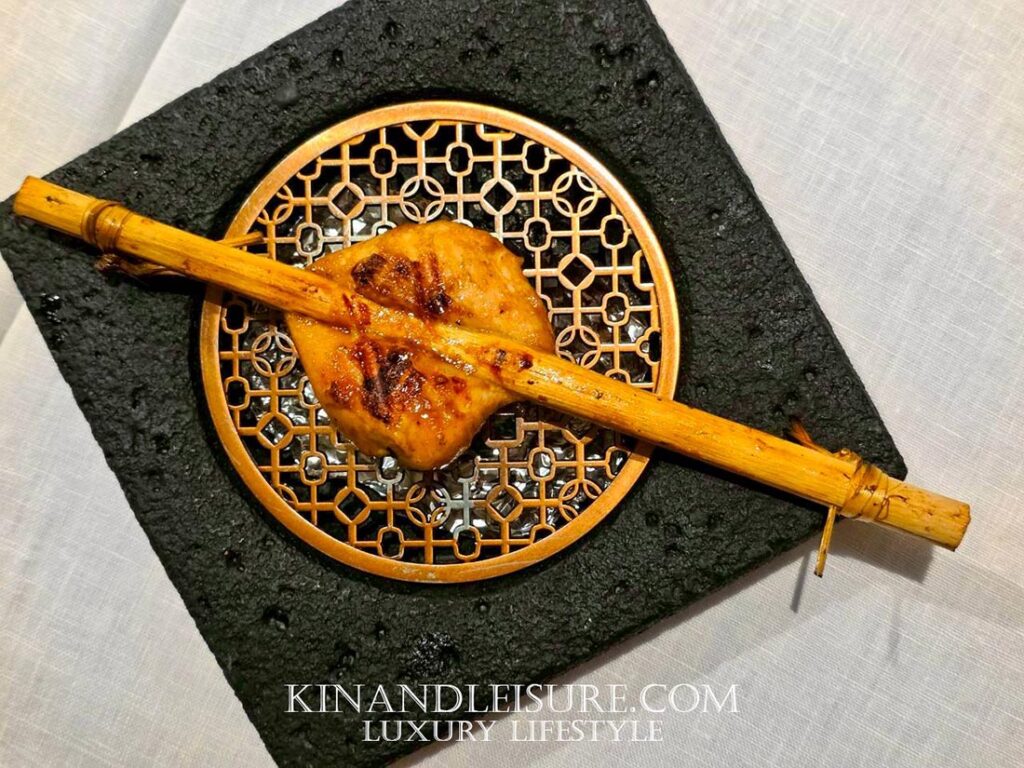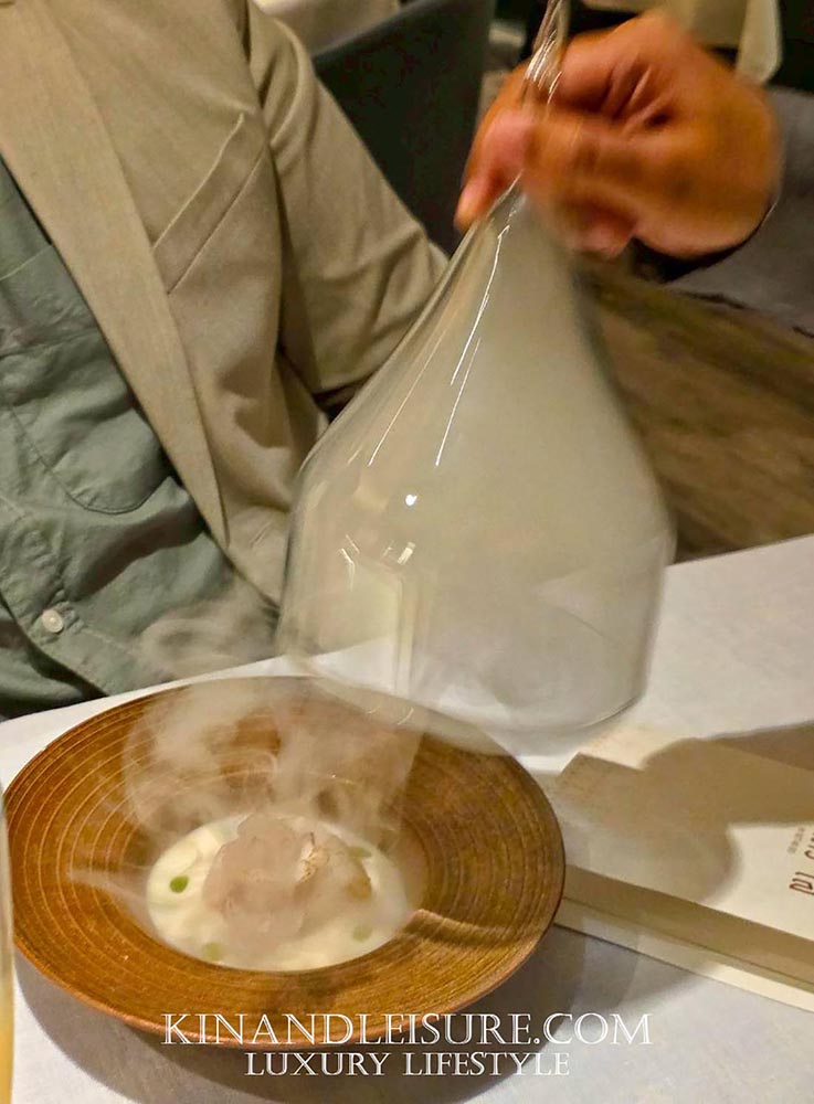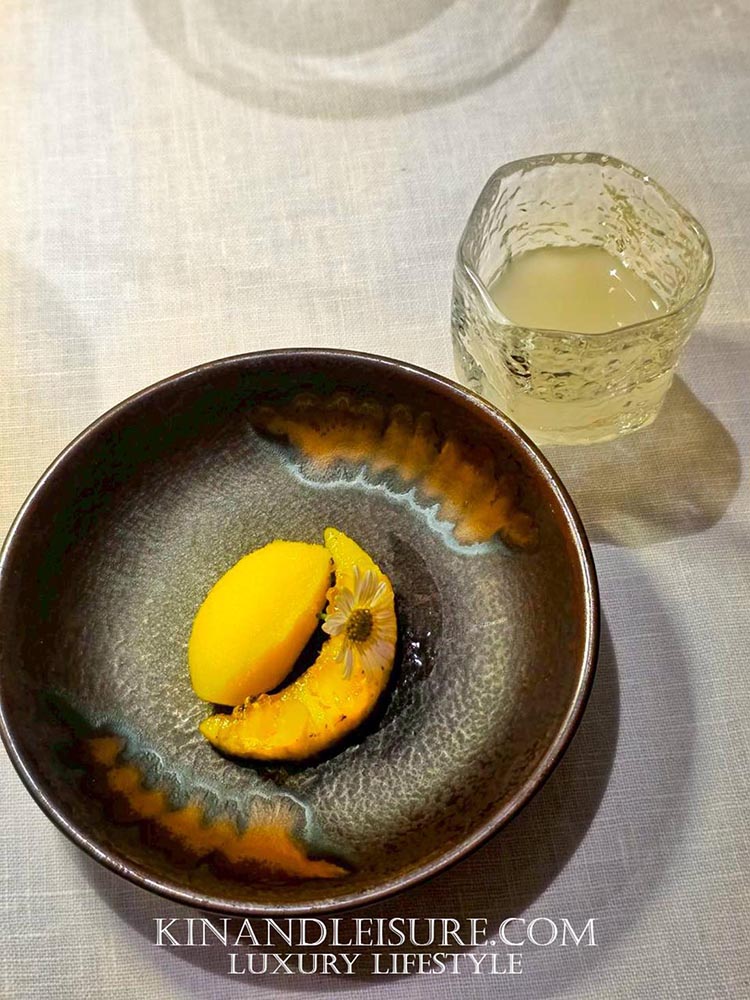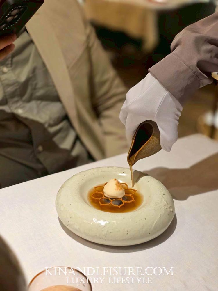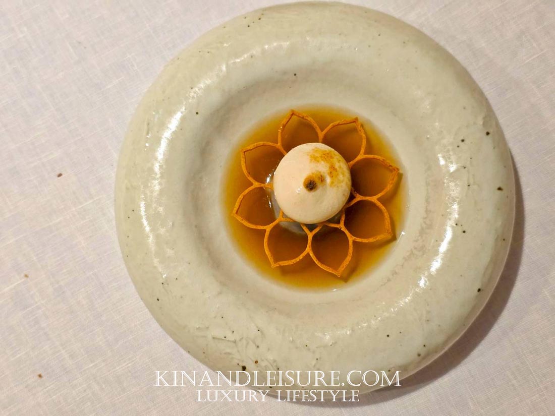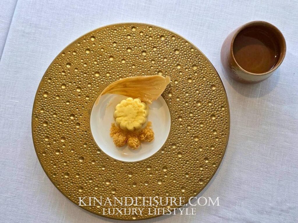 และมีความซับซ้อนของกลิ่นจาก สาโท “อากาศดีบ่โตวา” จากอุบลราชธานี รสชาติมีความเปรี้ยวหวานที่สดชื่นมาก มีกลิ่นอายของหมักบ่มจางๆ จากสาโทที่ทำให้เยลลี่คำนี้ดูมีมิติและดูหรูหราขึ้นมาทันที เป็นการล้างเพดานปากเตรียมรับจานหลักที่บูมบอกเลยว่ามีเรื่องราวที่น่าสนใจรออยู่ครับ การใช้วัตถุดิบจากท้องถิ่นไทยในรูปแบบนี้ทำให้เห็นถึงความพยายามของเชฟภูมิในการเชิดชูวัตถุดิบไทยสู่ระดับสากลจริงๆ ครับ