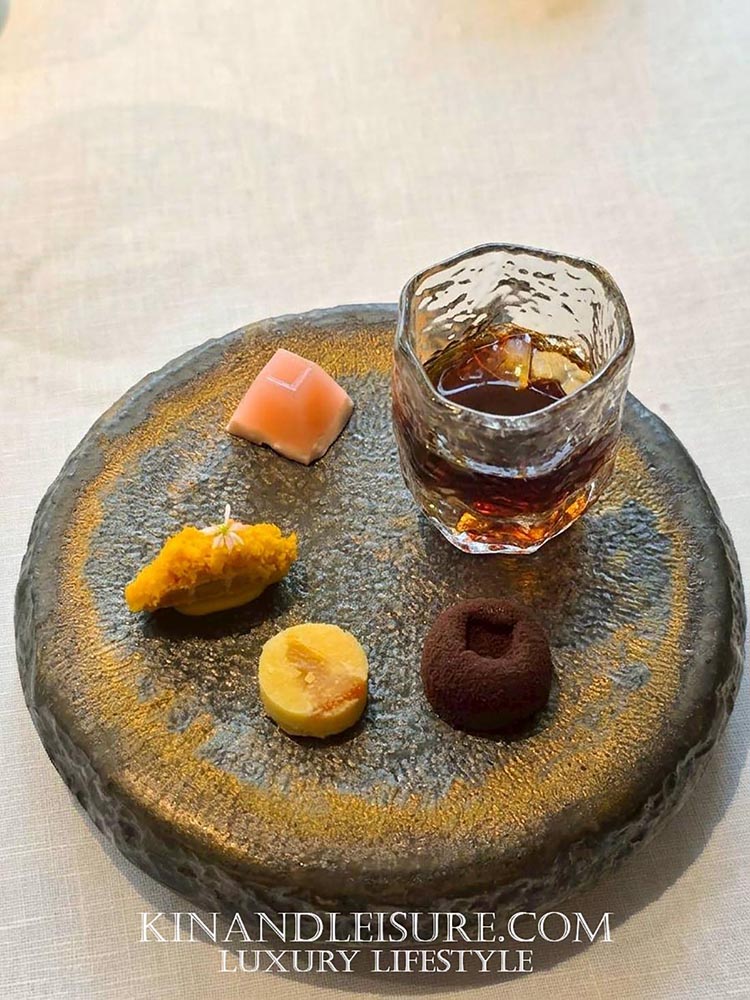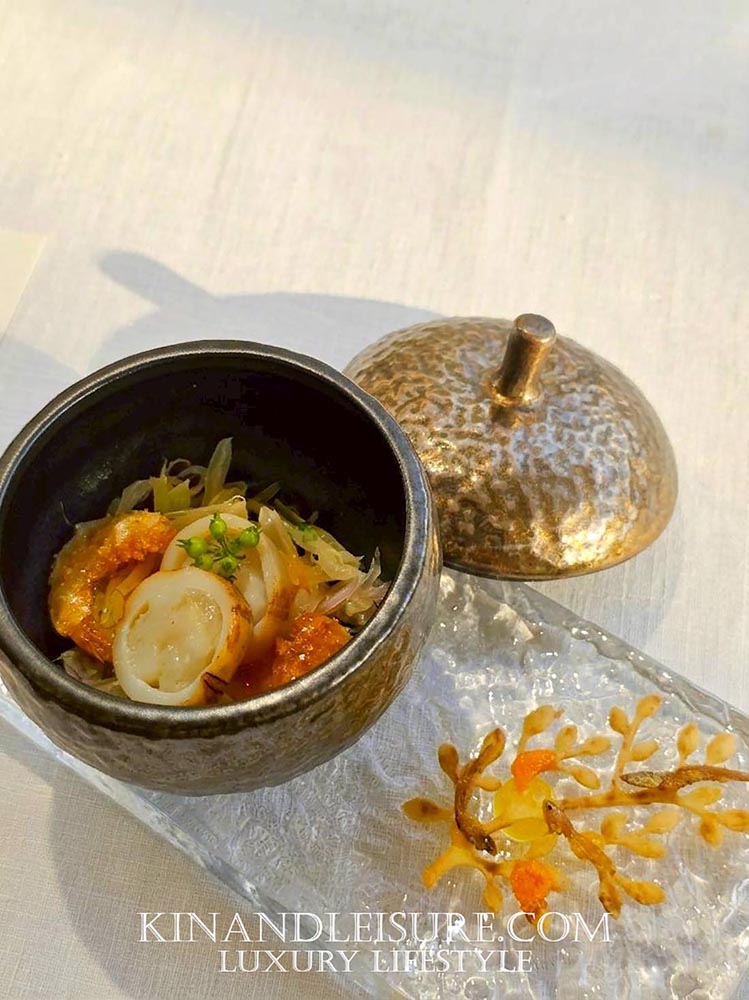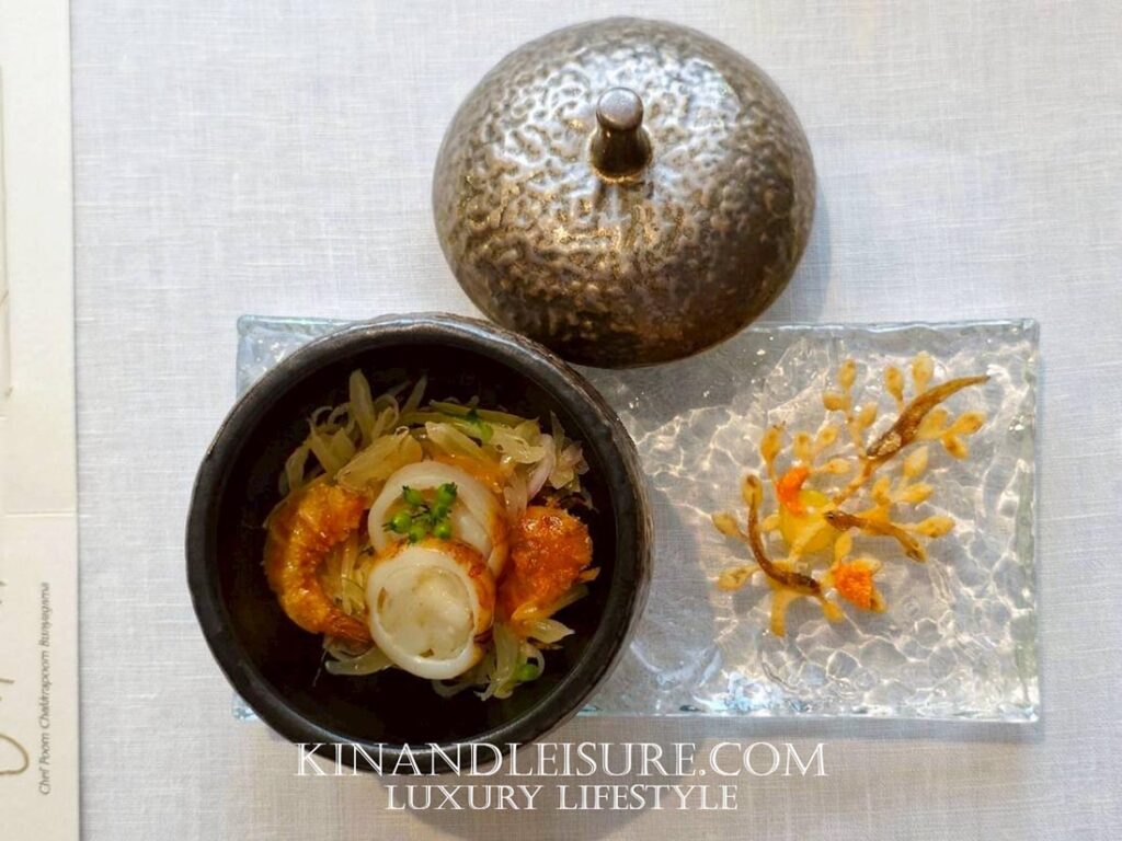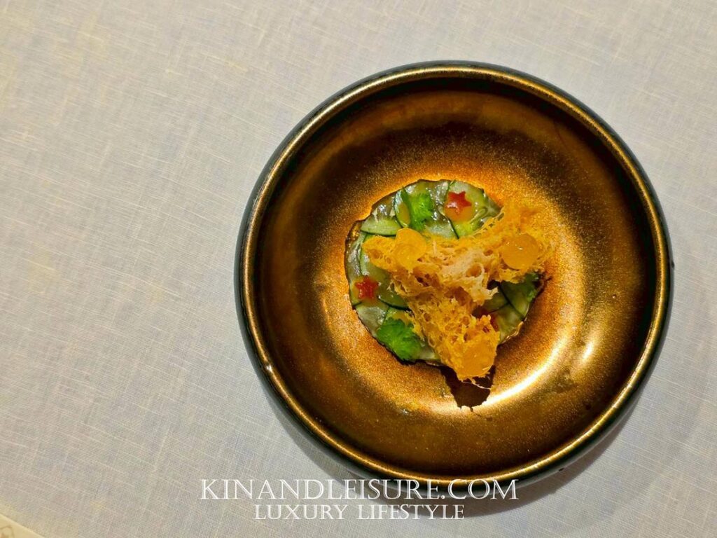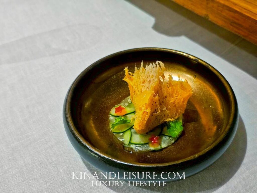 สิ่งที่บูมทึ่งคือการเสิร์ฟคู่กับ “อาจาด” ที่ทำจากคอมบูฉะชาเขียว ซึ่งเป็นเทคนิคการตัดเลี่ยนที่ฉลาดและมีชั้นเชิงมาก ความเปรี้ยวจากคอมบูฉะนุ่มนวลกว่าน้ำส้มสายชูทั่วไป และมีกลิ่นหอมของชาช่วยให้เพดานปากสะอาดขึ้น จานนี้ถือเป็นการเล่นกับ Texture ที่หลากหลาย ทั้งความกรอบ ความนุ่ม และความเด้งของเนื้อปู เป็นคำที่ทานแล้วรู้สึกถึงความประณีตของงานช่างเครื่องต้นอย่างแท้จริงครับ