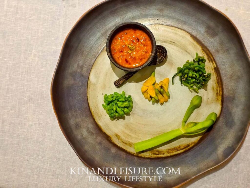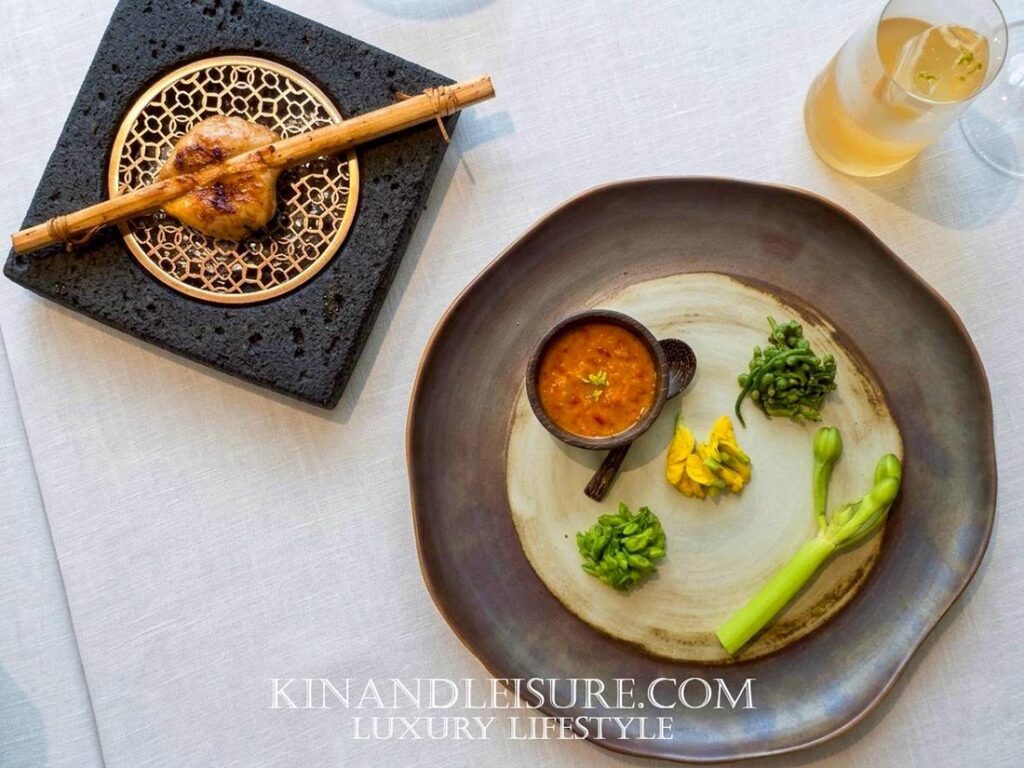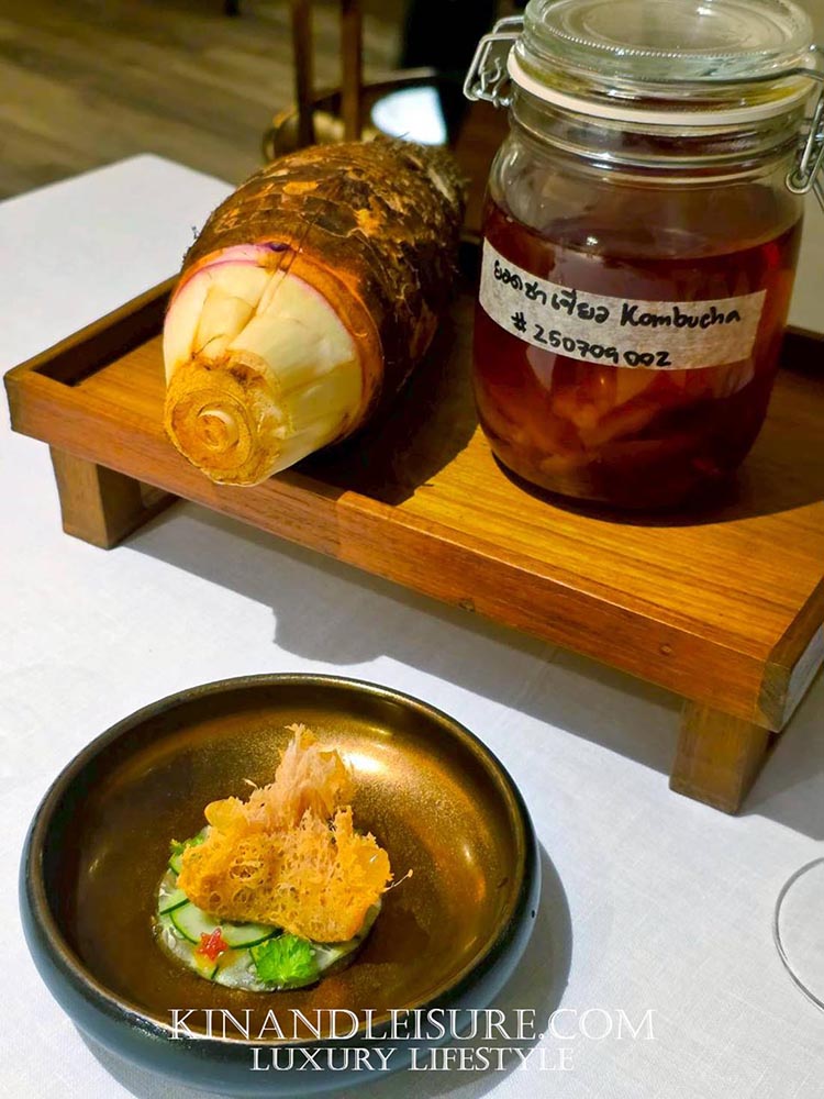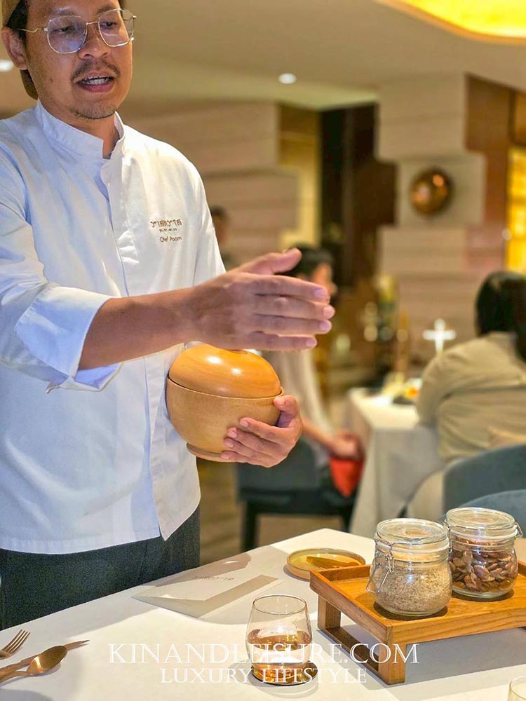 มื้อนี้รังสรรค์โดย เชฟภูมิ-จักรภูมิ บุณยาคม ผู้สืบทอดมรดกอาหาร (Heritage Recipes) จากบ้านบุญยาคมและสายสัมพันธ์ของวังเทวพรหม เชฟภูมิได้นำเทคนิคสมัยใหม่มาใช้ในการตีความอาหารไทยโบราณ (Reimagined) จนกลายเป็นสไตล์ Modern Royal Thai Cuisine ที่ได้รับรางวัล Thai Fine Dining Award จากการท่องเที่ยวแห่งประเทศไทยอีกด้วย ความใส่ใจของที่นี่ยังรวมไปถึงเครื่องปั้นดินเผาจากลำปางที่สั่งทำพิเศษเพื่อให้จานแต่ละใบเล่าเรื่องราวที่สอดรับกับอาหารได้อย่างลงตัวที่สุดครับ