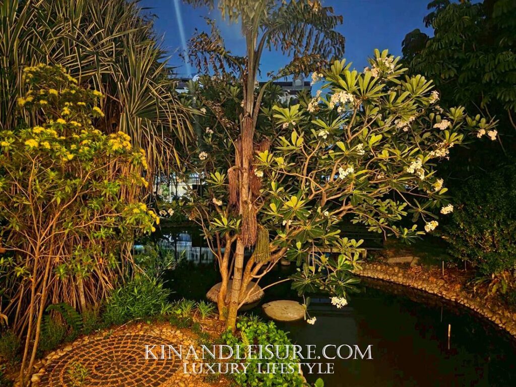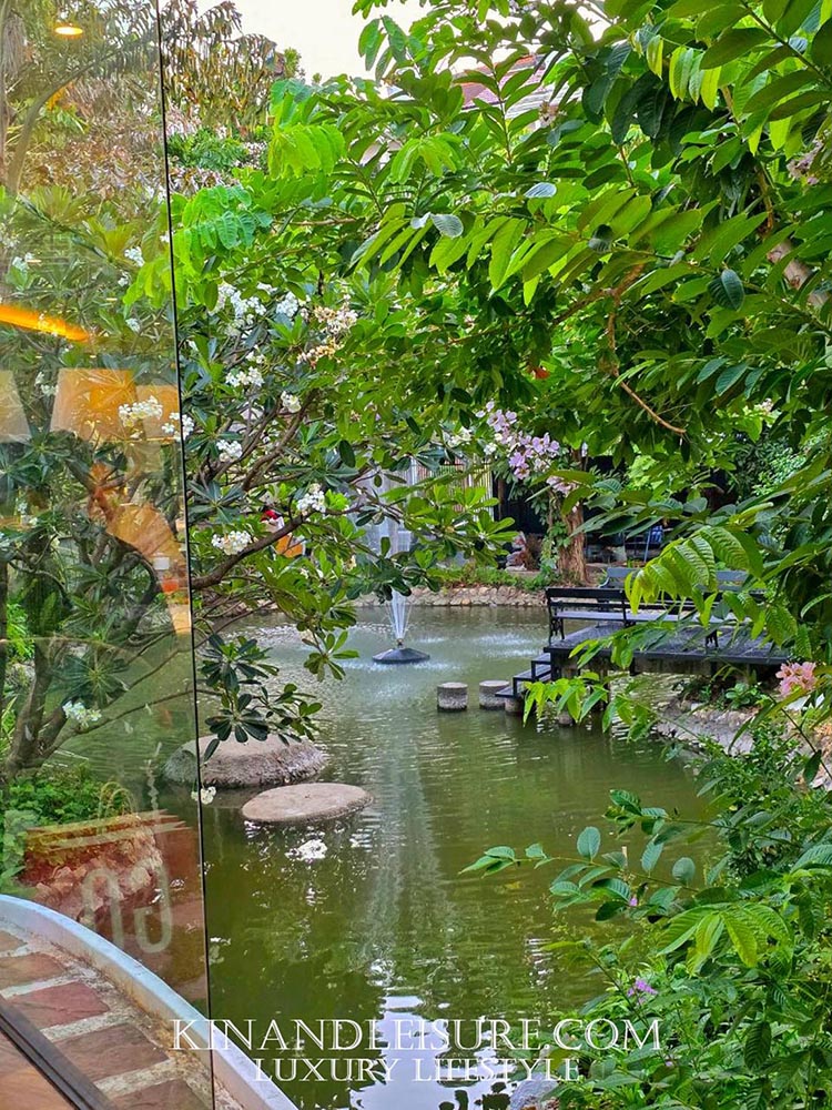ทางเดินเข้าสู่ร้านถูกโอบล้อมด้วยแมกไม้ที่คอยกรองเสียงรบกวนจากภายนอก บูมรู้สึกเหมือนได้ทิ้งความวุ่นวายไว้ที่ริมรั้วถนนเชื้อเพลิง และก้าวเข้าสู่ “วิมาน” ที่จัดสรรมาอย่างดี การวางตำแหน่งของต้นไม้ยังสอดคล้องกับทิศทางลมและแสงแดด ทำให้พื้นที่โดยรอบมีความถ่ายเทและไม่อึดอัด นอกจากนี้ยังมีองค์ประกอบของน้ำที่ช่วยเพิ่มความสดชื่นและเสียงที่สงบ สร้างบรรยากาศแบบบ้านสวนชาววังที่ให้ความรู้สึกผ่อนคลายตั้งแต่ก้าวแรกที่สัมผัสเลยครับ