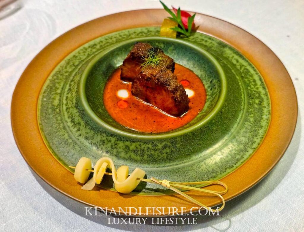 จานหลักจานนี้บูมขอบอกว่า “ห้ามพลาด” ครับ สำหรับจานหลักที่ถือเป็นหมุดหมายสำคัญของคอร์สนี้ เชฟภูมิเลือกนำเสนอ พะแนงเนื้อ ในรูปแบบที่เหนือระดับ เริ่มจากการคัดสรรวัตถุดิบหลักอย่าง เนื้อวากิวส่วน Striploin ที่ขึ้นชื่อเรื่องความนุ่มนวลและลายไขมันที่แทรกซึมอยู่อย่างสวยงามราวกับภาพวาด เชฟนำเนื้อไปผ่านความร้อนที่พอเหมาะจนผิวด้านนอกมีกลิ่นหอมจากการย่างแบบ Maillard Reaction
