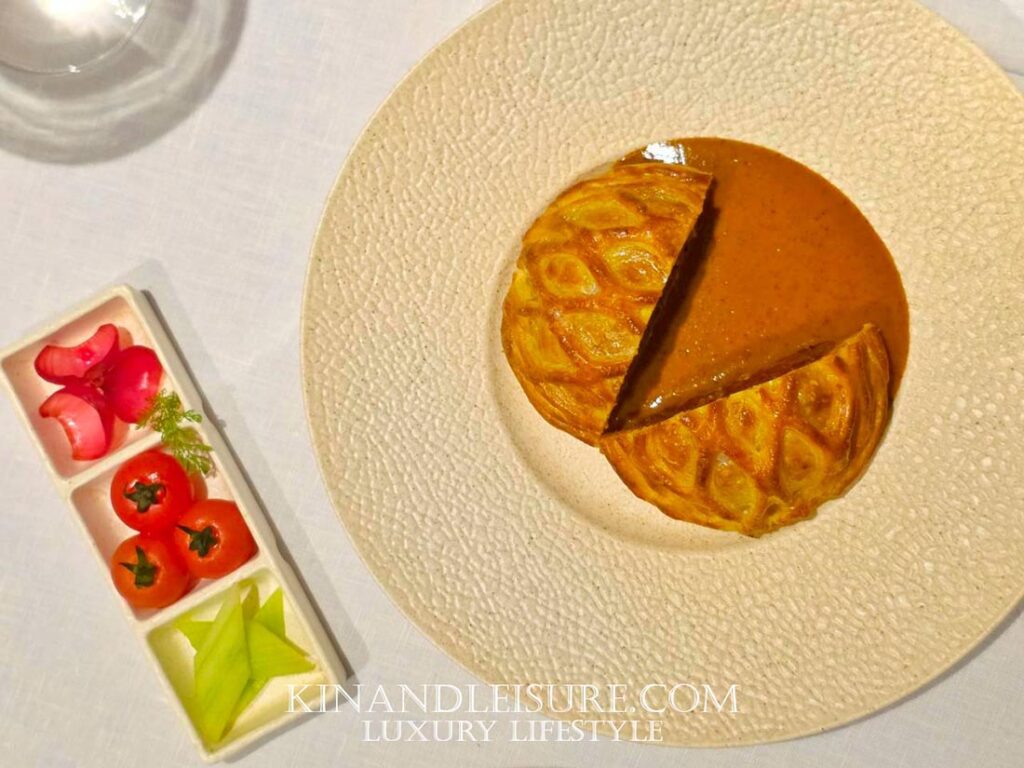 ในมื้อนี้ จานที่เป็นเสมือน “ยอดมงกุฎ” และเป็นบทพิสูจน์ฝีมือการตีความอาหารไทยสไตล์ Modern Royal ของเชฟภูมิได้ดีที่สุด คงหนีไม่พ้น Beef Wellington ซอสมัสมัน ครับ นี่คือการนำเมนูสุดคลาสสิกของอังกฤษที่มีประวัติศาสตร์ยาวนานตั้งแต่สมัยท่านดุ๊กแห่งเวลลิงตัน มาหลอมรวมกับ “แกงมัสมัน” ที่ CNN Travel ยกย่องให้เป็นอาหารที่อร่อยที่สุดในโลก