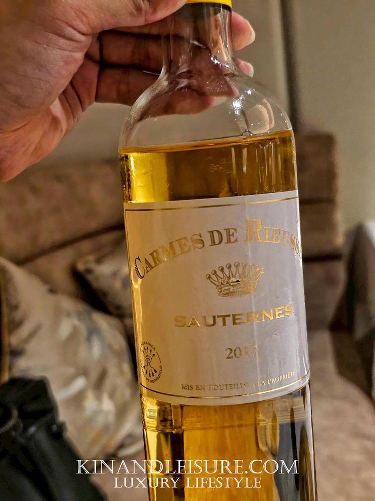 บูมทานคู่กับไวน์หวาน 2017 Carmes de Rieussec จาก Sauternes ที่มีกลิ่นพายสับปะรดและน้ำผึ้ง แต่คุณซันเสริมว่ามีกลิ่นรสแบบมะม่วงสุก บอกเลยว่าเป็นการจับคู่ที่สมบูรณ์แบบมาก เพราะรสชาติไปในทิศทางเดียวกันแต่ยังคงความโดดเด่นของทั้งอาหารและเครื่องดื่มไว้ได้อย่างยอดเยี่ยม เป็นคู่ที่ทานแล้วสนุกและมีความสุขมากครับ