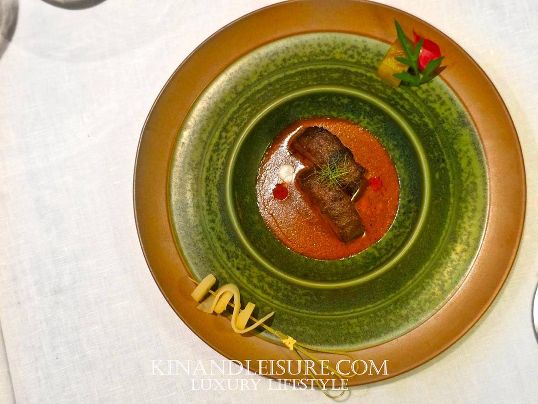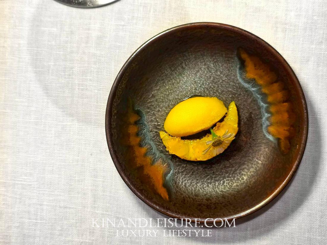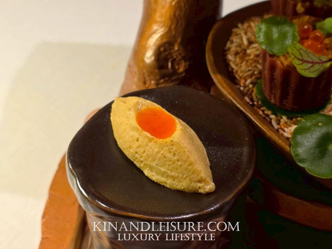 และมีความซับซ้อนของกลิ่นจาก สาโท “อากาศดีบ่โตวา” จากอุบลราชธานี รสชาติมีความเปรี้ยวหวานที่สดชื่นมาก มีกลิ่นอายของหมักบ่มจางๆ จากสาโทที่ทำให้เยลลี่คำนี้ดูมีมิติและดูหรูหราขึ้นมาทันที เป็นการล้างเพดานปากเตรียมรับจานหลักที่บูมบอกเลยว่ามีเรื่องราวที่น่าสนใจรออยู่ครับ การใช้วัตถุดิบจากท้องถิ่นไทยในรูปแบบนี้ทำให้เห็นถึงความพยายามของเชฟภูมิในการเชิดชูวัตถุดิบไทยสู่ระดับสากลจริงๆ ครับ