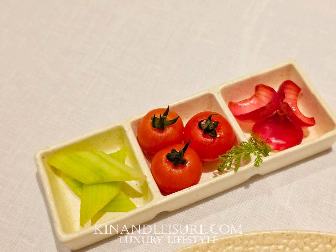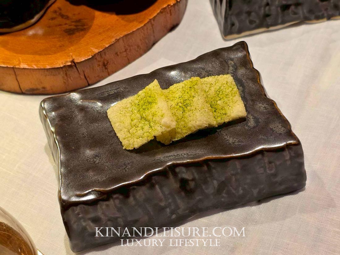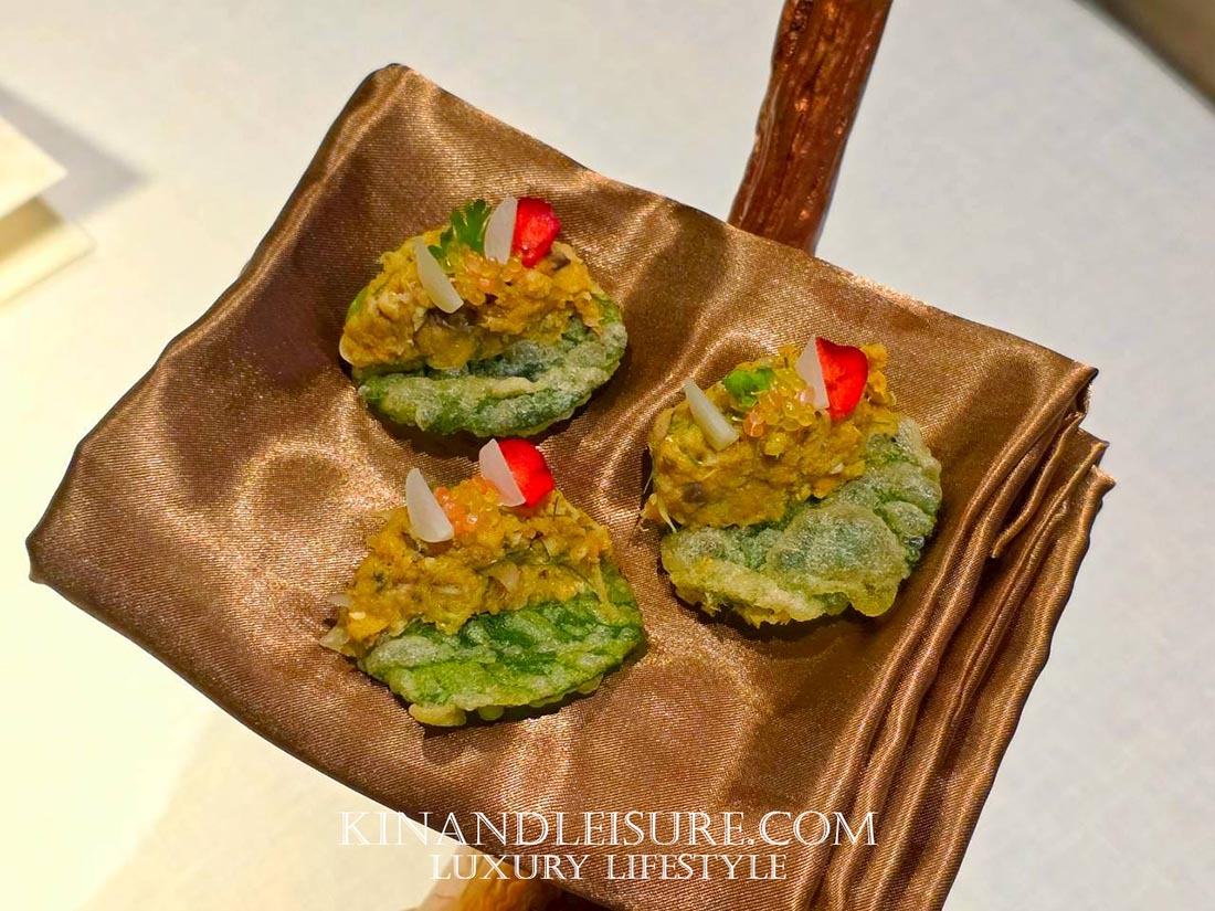 สิ่งที่บูมทึ่งคือการเสิร์ฟคู่กับ “อาจาด” ที่ทำจากคอมบูฉะชาเขียว ซึ่งเป็นเทคนิคการตัดเลี่ยนที่ฉลาดและมีชั้นเชิงมาก ความเปรี้ยวจากคอมบูฉะนุ่มนวลกว่าน้ำส้มสายชูทั่วไป และมีกลิ่นหอมของชาช่วยให้เพดานปากสะอาดขึ้น จานนี้ถือเป็นการเล่นกับ Texture ที่หลากหลาย ทั้งความกรอบ ความนุ่ม และความเด้งของเนื้อปู เป็นคำที่ทานแล้วรู้สึกถึงความประณีตของงานช่างเครื่องต้นอย่างแท้จริงครับ