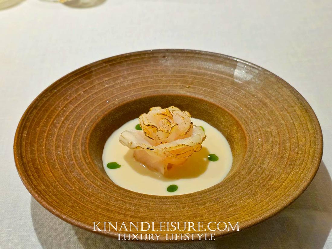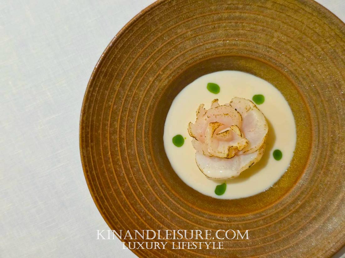 จานนี้คือการเปิดตัวที่บูมประทับใจมากครับ เชฟภูมิเลือกใช้ ปลากุดสลาด ซึ่งเป็นปลาเนื้อขาวชั้นเลิศ กว่าจะได้มาเชฟถึงขั้นไปประมูลมาจากประมงพื้นบ้านเลยทีเดียวเลยนะยะ