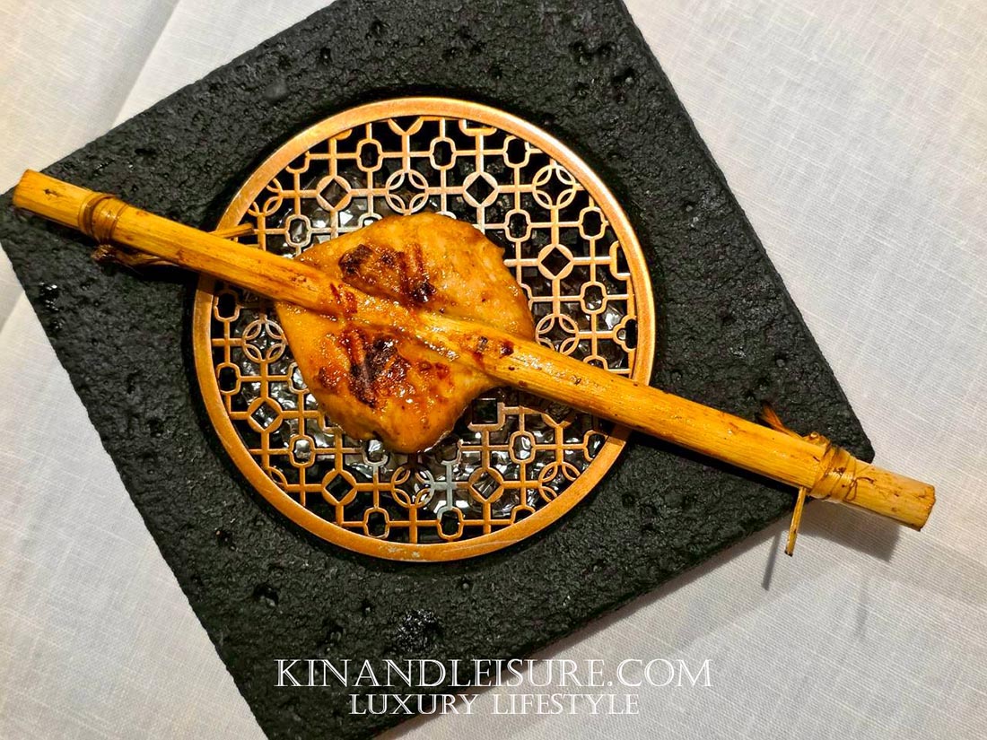 นำมาผ่านกระบวนการ Dry-Aged นานถึง 48 ชั่วโมง เพื่อให้ได้เนื้อสัมผัสที่แน่นและรสอูมามิที่ชัดเจนกว่าปลาสดทั่วไป ตัวซุปต้มข่าถูกนำมาสกัดเย็นและรมควันด้วยไม้โอ๊คออลเดอร์ (Alder Wood) จนได้กลิ่นหอมที่ซับซ้อนและนุ่มนวล