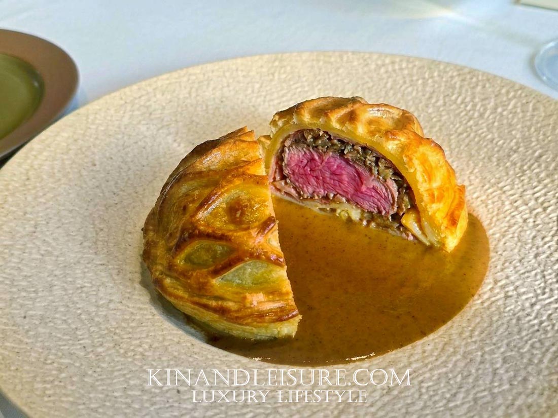 เชฟเริ่มจากการคัดสรรเนื้อวัวส่วนสันใน (Tenderloin) เกรดพรีเมียมที่มีความนุ่มนวลเป็นพิเศษ นำมาเซีย (Sear) บนกระทะร้อนๆ เพื่อล็อกความฉ่ำของเนื้อไว้ภายใน จากนั้นห่อหุ้มด้วย Duxelles หรือเห็ดแชมปิญองสับละเอียดที่เคี่ยวกับเนยและสมุนไพรจนงวดหอม แทนที่จะใช้พาร์มาแฮมแบบดั้งเดิม เชฟได้สอดแทรกจิตวิญญาณไทยลงไปในชั้นของการห่อ ก่อนจะคลุมด้วยแป้งพัฟพาสทรี (Puff Pastry) ที่รีดมาจนบางกำลังดี และนำไปอบจนแป้งฟูเป็นสีเหลืองทองอร่าม ลวดลายบนแป้งนั้นถูกกริตอย่างวิจิตรบรรจง สะท้อนถึงความประณีตของงานช่างเครื่องต้น